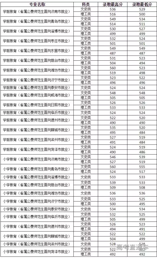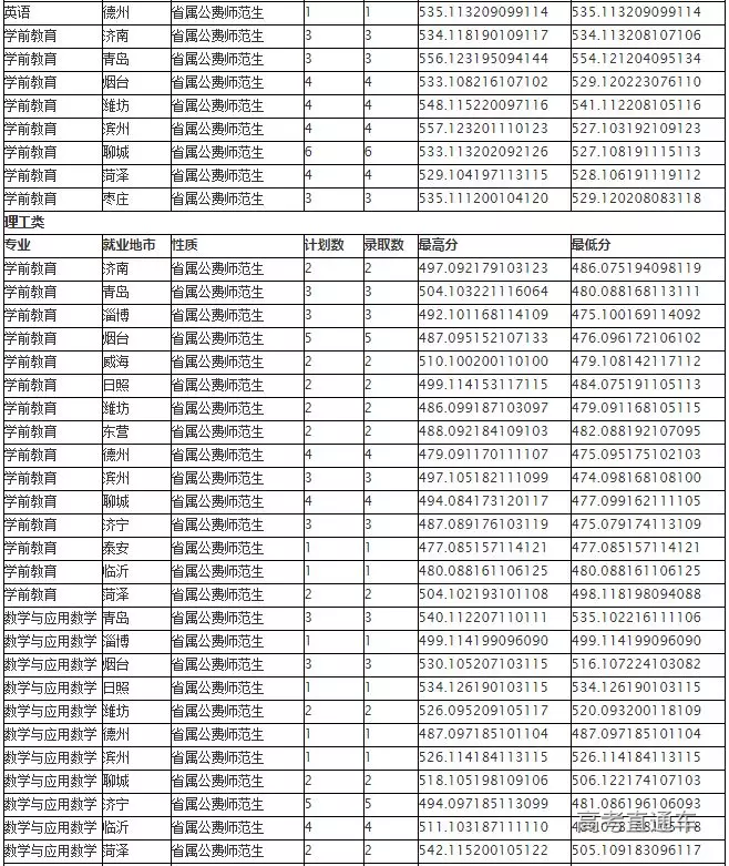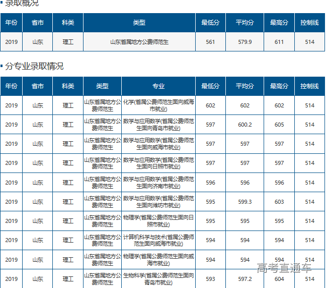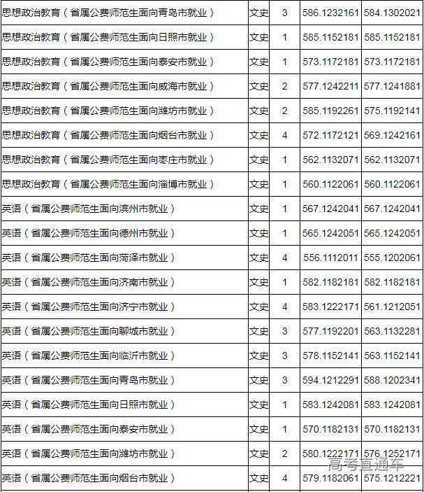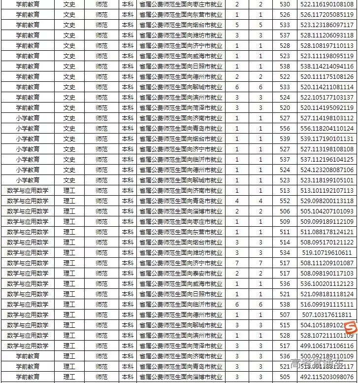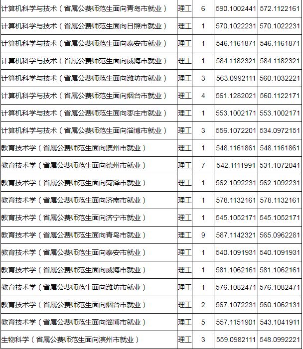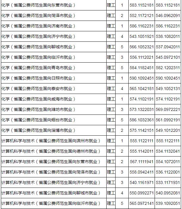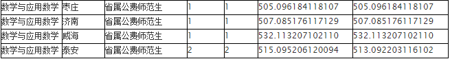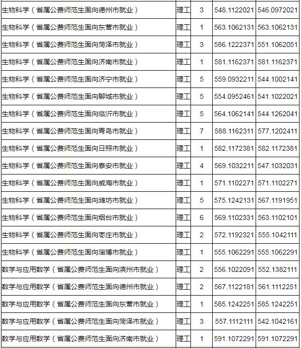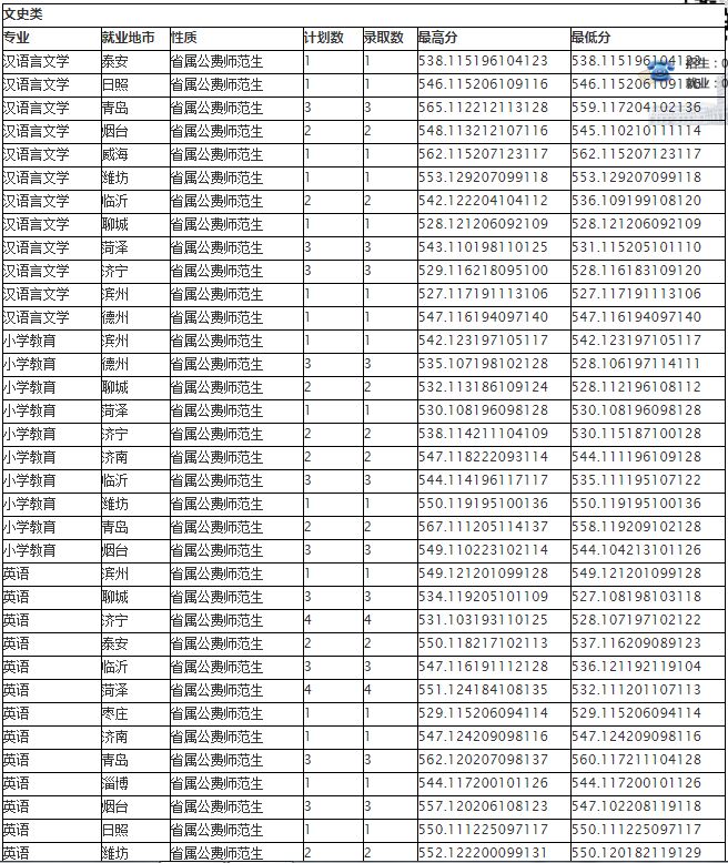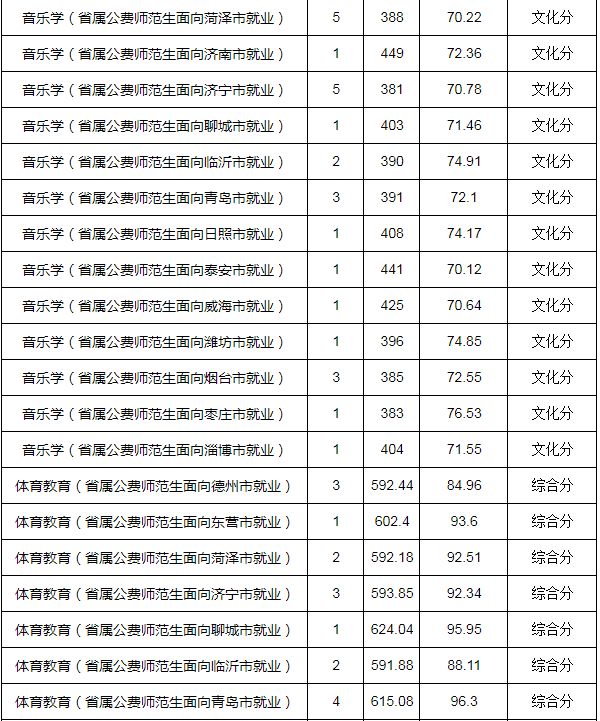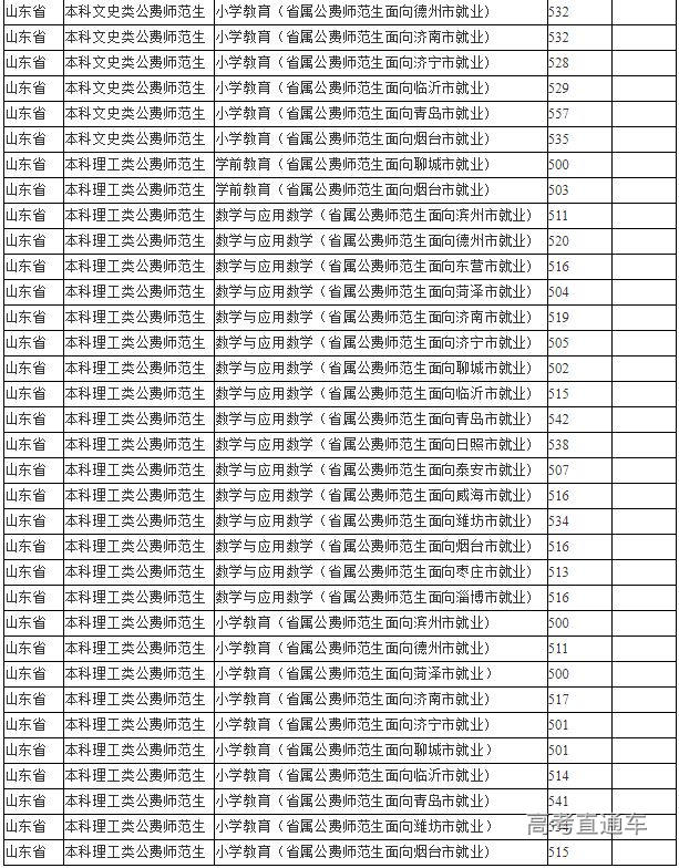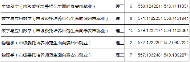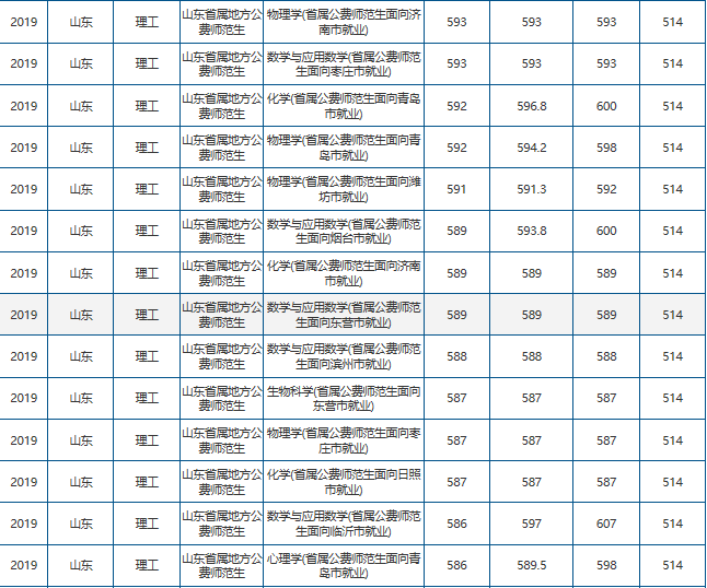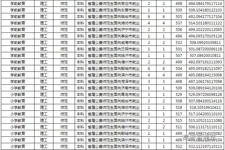 2019年山东省属院校公费师范生培养任务由山东师范大学、青岛大学、济南大学、山东理工大学、曲阜师范大学、聊城大学、鲁东大学、临沂大学、齐鲁师范学院、山东女子学院、潍坊学院、泰山学院、滨州学院、枣庄学院、菏泽学院、济宁学院、德州学院等17所高校承担。 委培师范生培养任务由山东师范大学、曲阜师范大学、聊城大学、鲁东大学、泰山学院、临沂大学、滨州学院等7所高校承担。 山东师范大学2019年公费师范生录取数据 2019年山东师范大学在山东省内共录取5330人。 山东省公费师范生、委培师范生、综合评价、普通文理类省内招生录取分数线再创历史新高。 本科提前批共录取1609人,其中录取公费师范生538人,文史类242人,最低分562分,录取位次13000名;理工类227人,最低分561分,录取位次43293名,较2018年文史类提升5000位次,理工类提升7000位次。 首次招收委培师范生,文史类最低分540分,理工类最低分556分。 2019年详细录取数据见下表: 青岛大学2019年公费师范生录取数据 2019年,公费师范生招生计划200人,比去年减少20人;招生专业5个,与去年持平。录取的文科最高分595分,高重点线53分;理科最高分586分,高重点线72分。 济南大学2019年公费师范生录取数据 济南大学在山东省属地方公费师范生招生录取结束。理工录取109人,省控线443分,录取成绩最低516分;文史录取106人,省控线503分,录取成绩最低539分。 山东理工大学2019年公费师范生录取数据 曲阜师范大学2019年公费师范生录取数据 聊城大学2019年公费师范生录取数据 聊城大学2019年在山东省本科提前批录取工作自7月2日开始,于7月10日顺利结束,首次志愿即完成招生计划。本科提前批包括公费师范生(含艺术类、体育类、普通文理类)、委培师范生及公费农科生招生专业,共录取752人。其中,公费师范生594人,委培师范生128人,公费农科生30人。 从录取情况看,生源数量充足,生源质量进一步提高。2019年,公费师范生文史类录取平均分为556分,超出自主招生录取控制参考线14分;理工类录取平均分为538分,超出自主招生录取控制参考线24分;艺术体育类生源质量较往年也有明显提高。 委培师范生是山东省2019年新增招生类型,生源数量充足,生源质量较高,文史类录取平均分为550分(面向泰安)、543分(面向滨州),分别超出自主招生录取控制参考线8分和1分;理工类录取平均分为536分(面向泰安)、523分(面向滨州),分别超出自主招生录取控制参考线22分和9分。公费农科生是我校2019年新增招生类型,招生专业为植物保护,录取平均分为512分,超出普通批录取控制分数线69分。 鲁东大学2019年公费师范生录取数据 齐鲁师范学院2019年公费师范生录取数据 7月10日,齐鲁师范学院本科提前批公费师范生已录取结束。共录取考生300人。 艺术文文化最高分492分,最低分448分,专业最高分246.66分,最低分216分。理科最高分569.114分,最低分504.083分。文科最高分577.123分,最低分529.114。 具体分专业分地市录取情况如下: 山东女子学院2019年公费师范生录取数据 枣庄学院2019年公费师范生录取数据 菏泽学院2019年公费师范生录取数据 济宁学院2019年公费师范生录取数据 德州学院2019年公费师范生录取数据 德州学院2019年山东省本科提前批公费师范生录取完成!共录取180名新生!