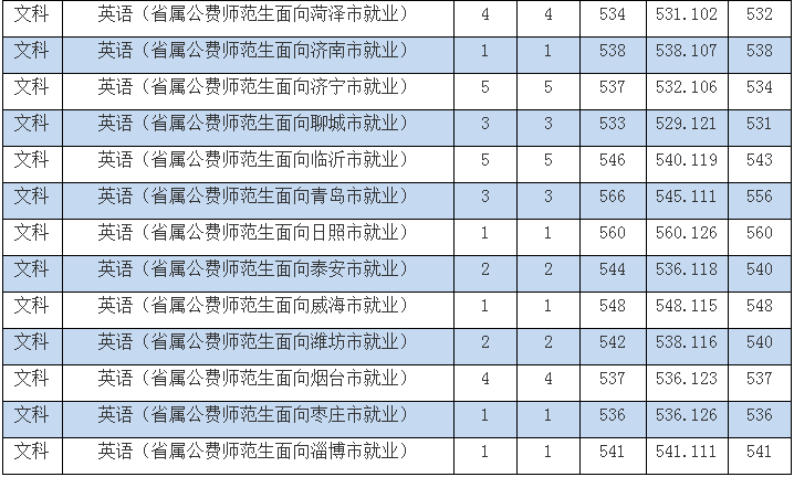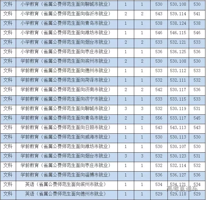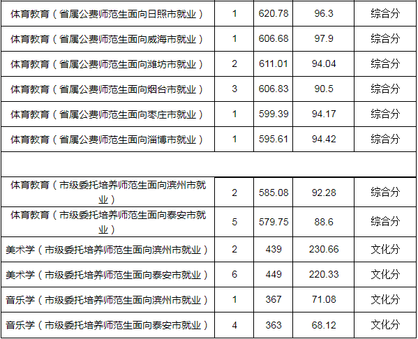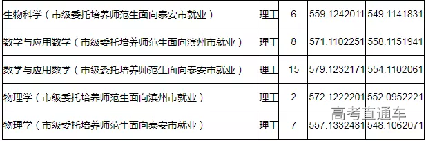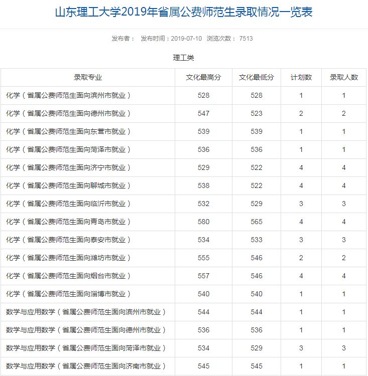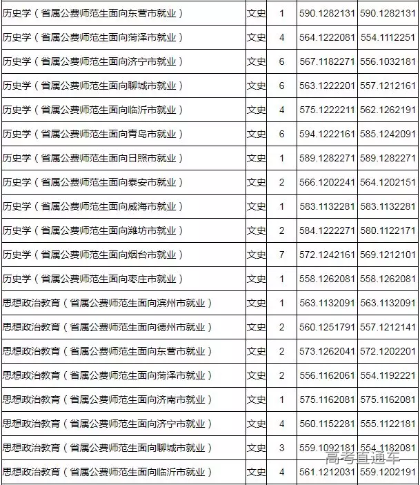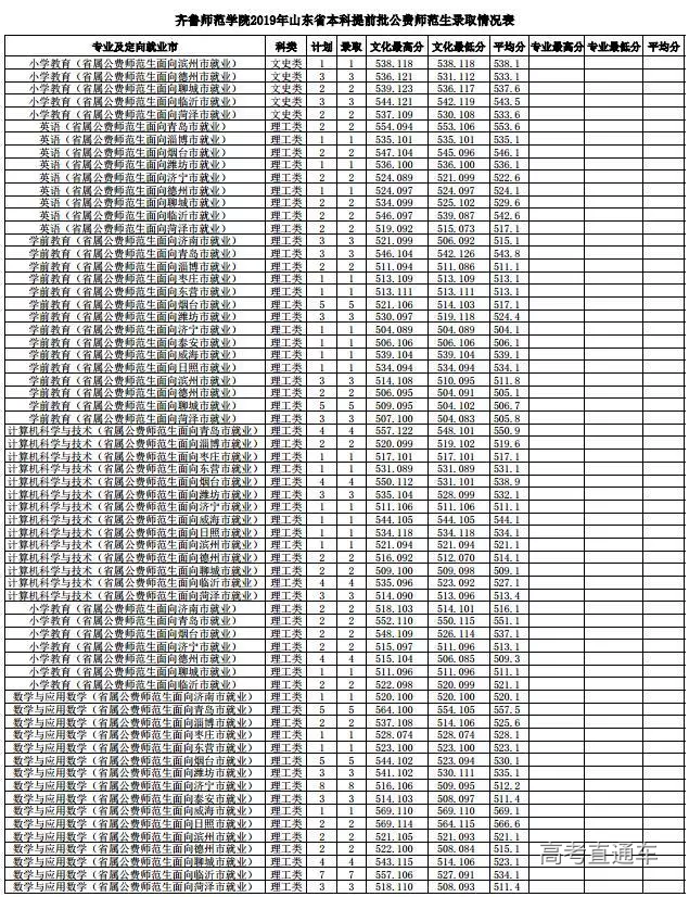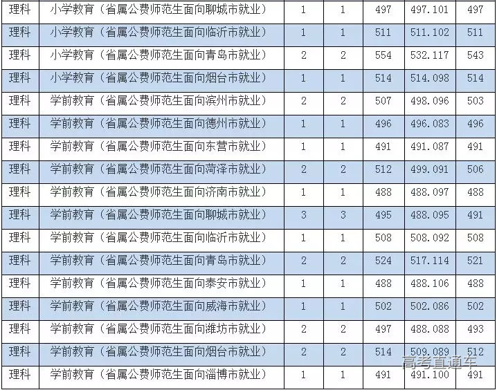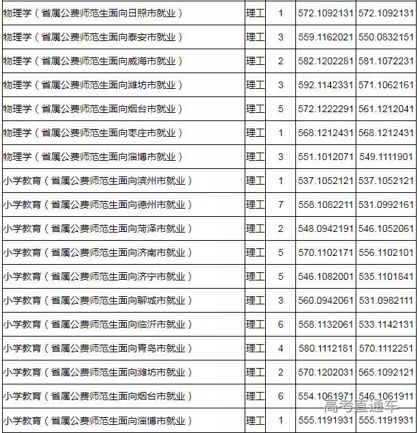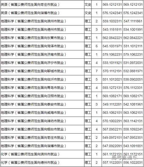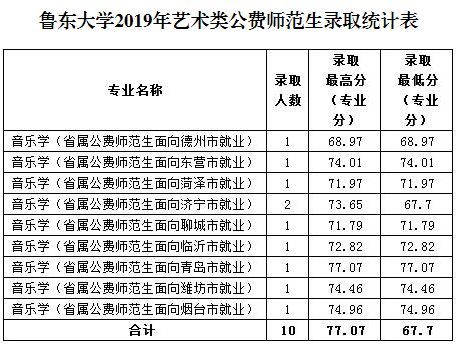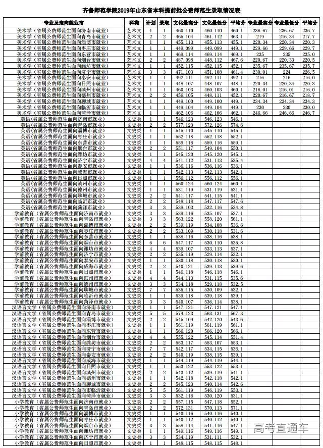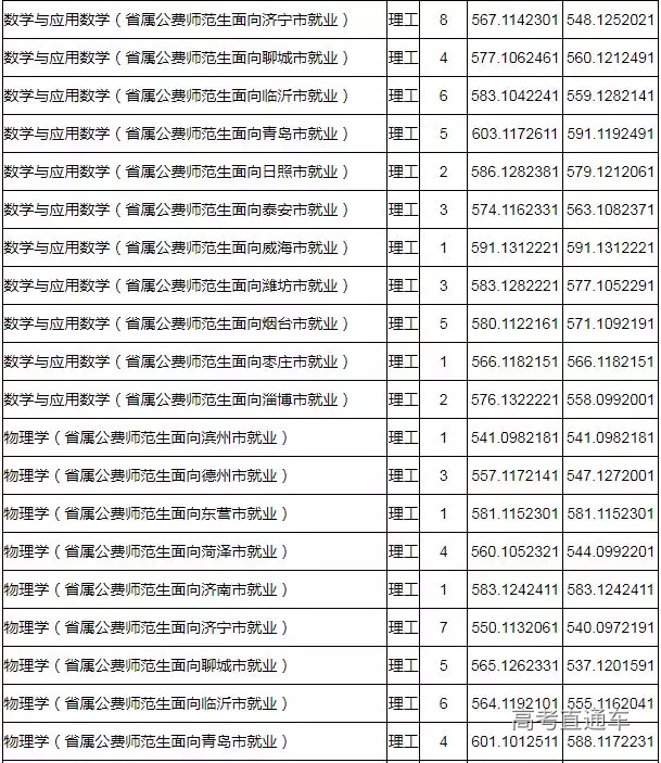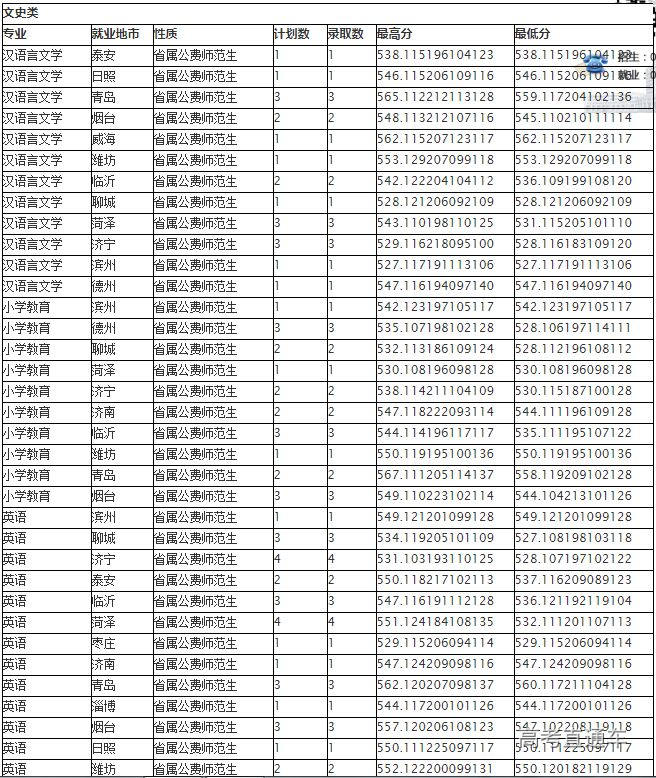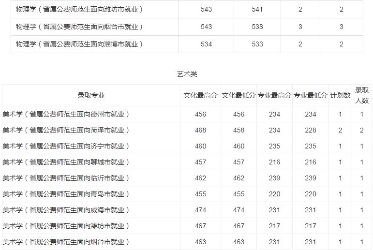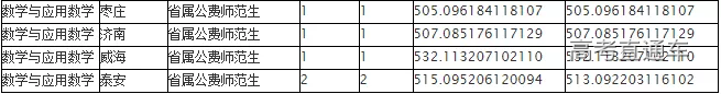 2019年山东省属院校公费师范生培养任务由山东师范大学、青岛大学、济南大学、山东理工大学、曲阜师范大学、聊城大学、鲁东大学、临沂大学、齐鲁师范学院、山东女子学院、潍坊学院、泰山学院、滨州学院、枣庄学院、菏泽学院、济宁学院、德州学院等17所高校承担。 委培师范生培养任务由山东师范大学、曲阜师范大学、聊城大学、鲁东大学、泰山学院、临沂大学、滨州学院等7所高校承担。 山东师范大学2019年公费师范生录取数据 2019年山东师范大学在山东省内共录取5330人。 山东省公费师范生、委培师范生、综合评价、普通文理类省内招生录取分数线再创历史新高。 本科提前批共录取1609人,其中录取公费师范生538人,文史类242人,最低分562分,录取位次13000名;理工类227人,最低分561分,录取位次43293名,较2018年文史类提升5000位次,理工类提升7000位次。 首次招收委培师范生,文史类最低分540分,理工类最低分556分。 2019年详细录取数据见下表: 青岛大学2019年公费师范生录取数据 2019年,公费师范生招生计划200人,比去年减少20人;招生专业5个,与去年持平。录取的文科最高分595分,高重点线53分;理科最高分586分,高重点线72分。 济南大学2019年公费师范生录取数据 济南大学在山东省属地方公费师范生招生录取结束。理工录取109人,省控线443分,录取成绩最低516分;文史录取106人,省控线503分,录取成绩最低539分。 山东理工大学2019年公费师范生录取数据 曲阜师范大学2019年公费师范生录取数据 聊城大学2019年公费师范生录取数据 聊城大学2019年在山东省本科提前批录取工作自7月2日开始,于7月10日顺利结束,首次志愿即完成招生计划。本科提前批包括公费师范生(含艺术类、体育类、普通文理类)、委培师范生及公费农科生招生专业,共录取752人。其中,公费师范生594人,委培师范生128人,公费农科生30人。 从录取情况看,生源数量充足,生源质量进一步提高。2019年,公费师范生文史类录取平均分为556分,超出自主招生录取控制参考线14分;理工类录取平均分为538分,超出自主招生录取控制参考线24分;艺术体育类生源质量较往年也有明显提高。 委培师范生是山东省2019年新增招生类型,生源数量充足,生源质量较高,文史类录取平均分为550分(面向泰安)、543分(面向滨州),分别超出自主招生录取控制参考线8分和1分;理工类录取平均分为536分(面向泰安)、523分(面向滨州),分别超出自主招生录取控制参考线22分和9分。公费农科生是我校2019年新增招生类型,招生专业为植物保护,录取平均分为512分,超出普通批录取控制分数线69分。 鲁东大学2019年公费师范生录取数据 齐鲁师范学院2019年公费师范生录取数据 7月10日,齐鲁师范学院本科提前批公费师范生已录取结束。共录取考生300人。 艺术文文化最高分492分,最低分448分,专业最高分246.66分,最低分216分。理科最高分569.114分,最低分504.083分。文科最高分577.123分,最低分529.114。 具体分专业分地市录取情况如下: 山东女子学院2019年公费师范生录取数据 枣庄学院2019年公费师范生录取数据 菏泽学院2019年公费师范生录取数据 济宁学院2019年公费师范生录取数据 德州学院2019年公费师范生录取数据 德州学院2019年山东省本科提前批公费师范生录取完成!共录取180名新生!