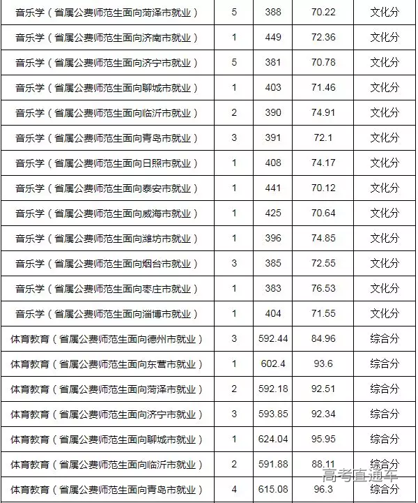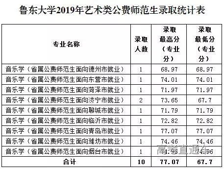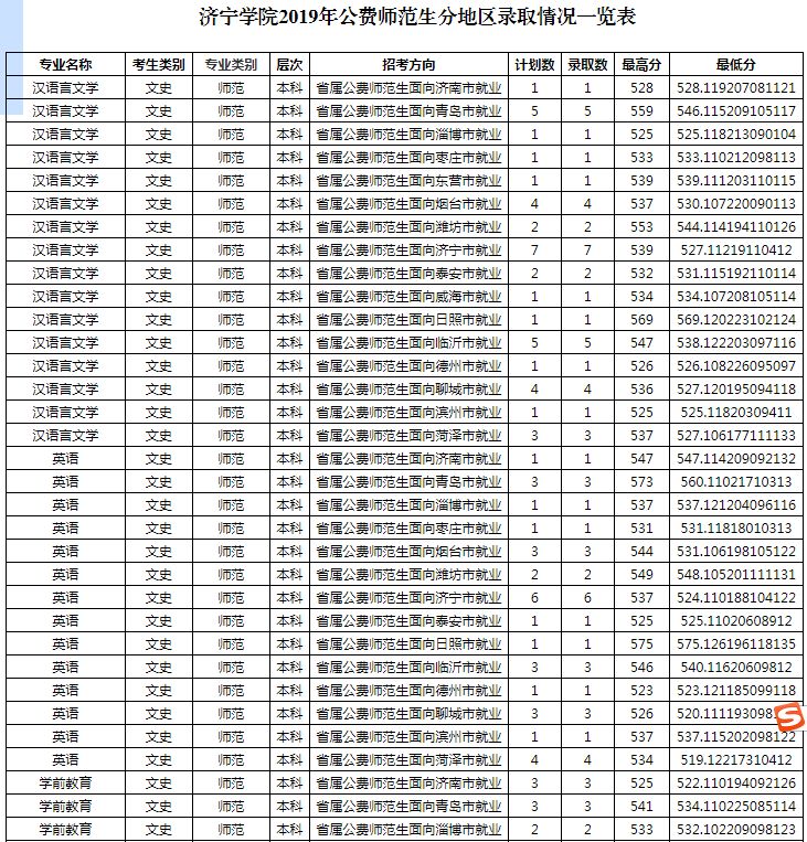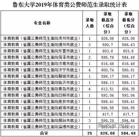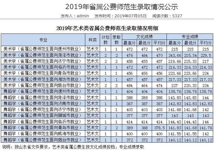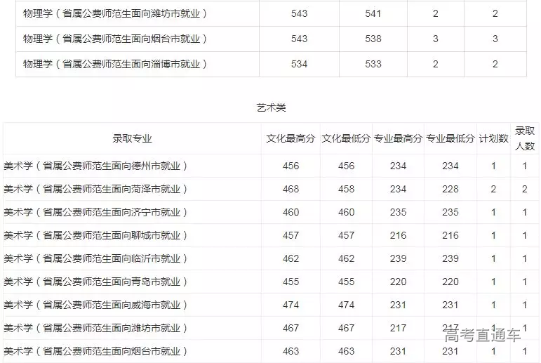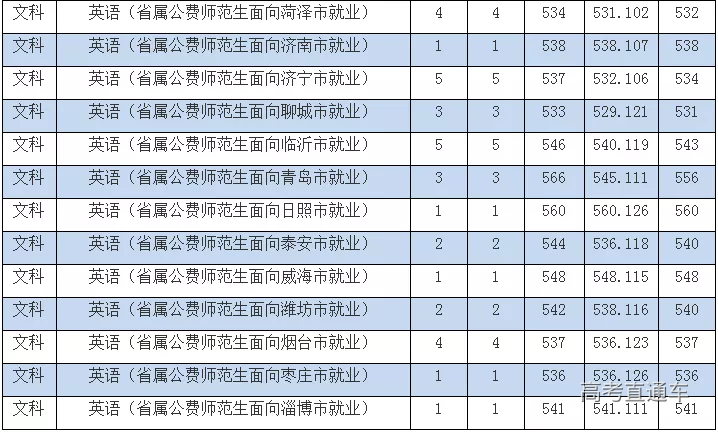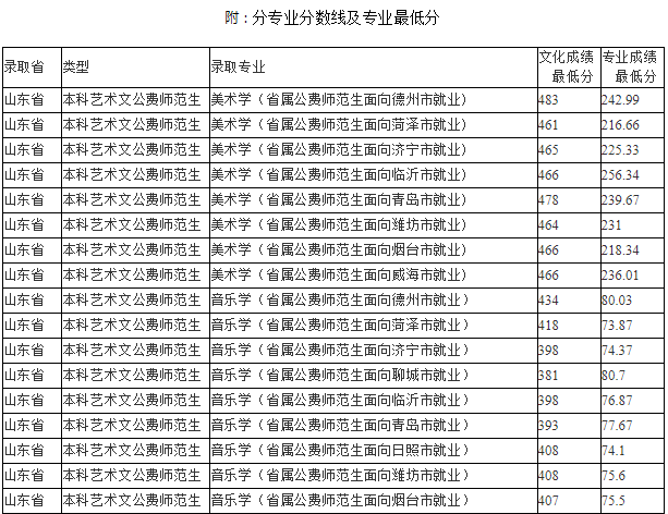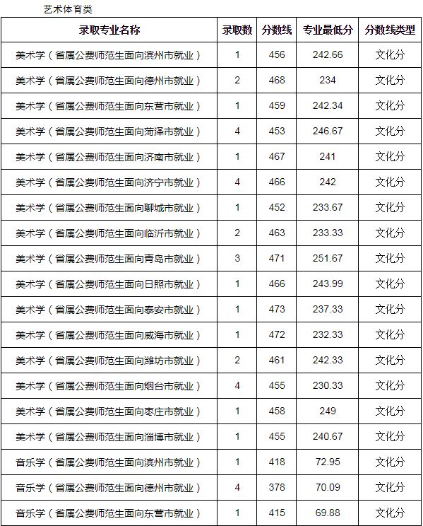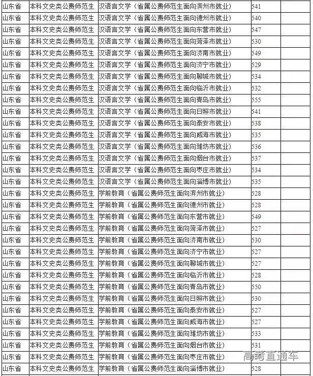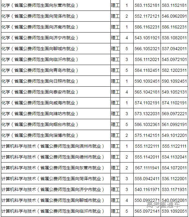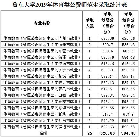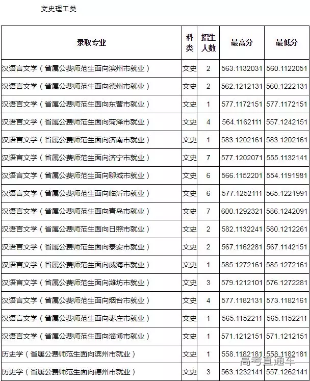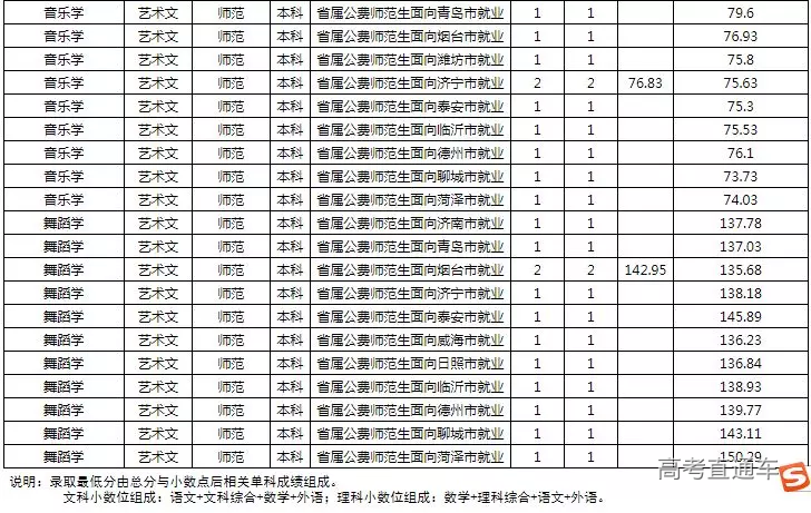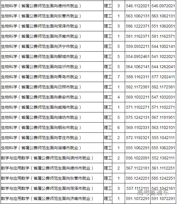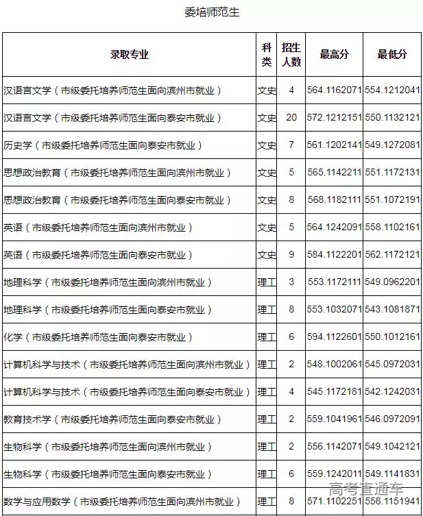 2019年山东省属院校公费师范生培养任务由山东师范大学、青岛大学、济南大学、山东理工大学、曲阜师范大学、聊城大学、鲁东大学、临沂大学、齐鲁师范学院、山东女子学院、潍坊学院、泰山学院、滨州学院、枣庄学院、菏泽学院、济宁学院、德州学院等17所高校承担。 委培师范生培养任务由山东师范大学、曲阜师范大学、聊城大学、鲁东大学、泰山学院、临沂大学、滨州学院等7所高校承担。 山东师范大学2019年公费师范生录取数据 2019年山东师范大学在山东省内共录取5330人。 山东省公费师范生、委培师范生、综合评价、普通文理类省内招生录取分数线再创历史新高。 本科提前批共录取1609人,其中录取公费师范生538人,文史类242人,最低分562分,录取位次13000名;理工类227人,最低分561分,录取位次43293名,较2018年文史类提升5000位次,理工类提升7000位次。 首次招收委培师范生,文史类最低分540分,理工类最低分556分。 2019年详细录取数据见下表: 青岛大学2019年公费师范生录取数据 2019年,公费师范生招生计划200人,比去年减少20人;招生专业5个,与去年持平。录取的文科最高分595分,高重点线53分;理科最高分586分,高重点线72分。 济南大学2019年公费师范生录取数据 济南大学在山东省属地方公费师范生招生录取结束。理工录取109人,省控线443分,录取成绩最低516分;文史录取106人,省控线503分,录取成绩最低539分。 山东理工大学2019年公费师范生录取数据 曲阜师范大学2019年公费师范生录取数据 聊城大学2019年公费师范生录取数据 聊城大学2019年在山东省本科提前批录取工作自7月2日开始,于7月10日顺利结束,首次志愿即完成招生计划。本科提前批包括公费师范生(含艺术类、体育类、普通文理类)、委培师范生及公费农科生招生专业,共录取752人。其中,公费师范生594人,委培师范生128人,公费农科生30人。 从录取情况看,生源数量充足,生源质量进一步提高。2019年,公费师范生文史类录取平均分为556分,超出自主招生录取控制参考线14分;理工类录取平均分为538分,超出自主招生录取控制参考线24分;艺术体育类生源质量较往年也有明显提高。 委培师范生是山东省2019年新增招生类型,生源数量充足,生源质量较高,文史类录取平均分为550分(面向泰安)、543分(面向滨州),分别超出自主招生录取控制参考线8分和1分;理工类录取平均分为536分(面向泰安)、523分(面向滨州),分别超出自主招生录取控制参考线22分和9分。公费农科生是我校2019年新增招生类型,招生专业为植物保护,录取平均分为512分,超出普通批录取控制分数线69分。 鲁东大学2019年公费师范生录取数据 齐鲁师范学院2019年公费师范生录取数据 7月10日,齐鲁师范学院本科提前批公费师范生已录取结束。共录取考生300人。 艺术文文化最高分492分,最低分448分,专业最高分246.66分,最低分216分。理科最高分569.114分,最低分504.083分。文科最高分577.123分,最低分529.114。 具体分专业分地市录取情况如下: 山东女子学院2019年公费师范生录取数据 枣庄学院2019年公费师范生录取数据 菏泽学院2019年公费师范生录取数据 济宁学院2019年公费师范生录取数据 德州学院2019年公费师范生录取数据 德州学院2019年山东省本科提前批公费师范生录取完成!共录取180名新生!