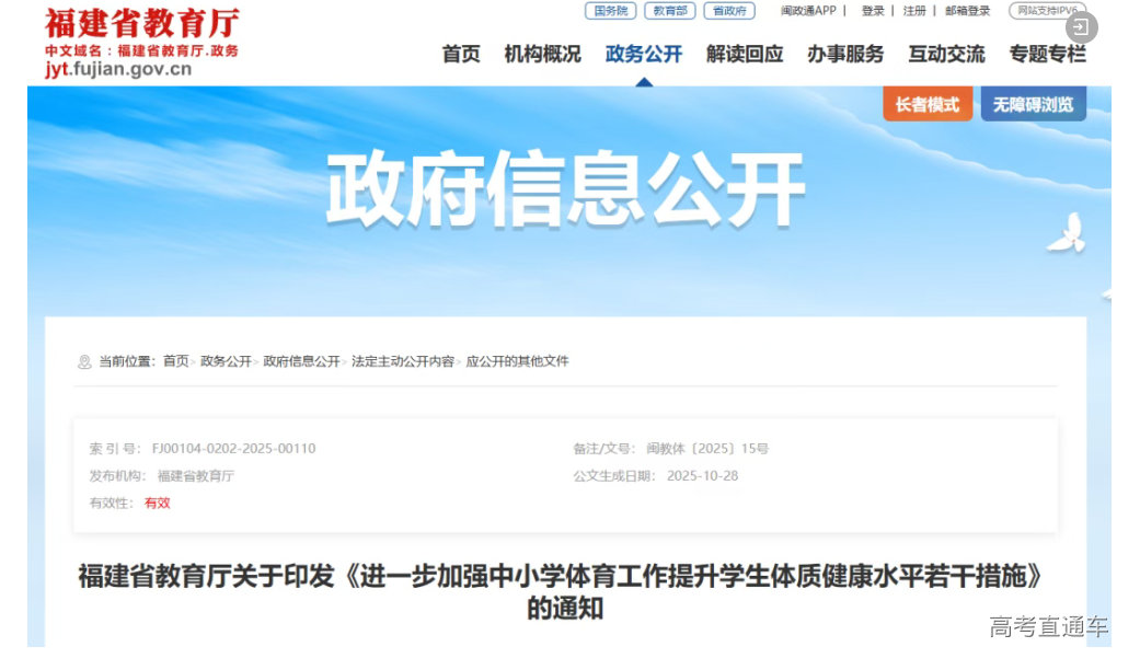 刚刚,福建省教育厅印发《进一步加强中小学体育工作提升学生体质健康水平若干措施》。文件指出,自2026年中考开始,体育与健康考试将进行优化调整,总分值40分保持不变,但考核方式、项目选择及分值分配均有优化,同时厦门市、泉州市作为教育部中考改革试点,将先行先试探索体育中考改革。