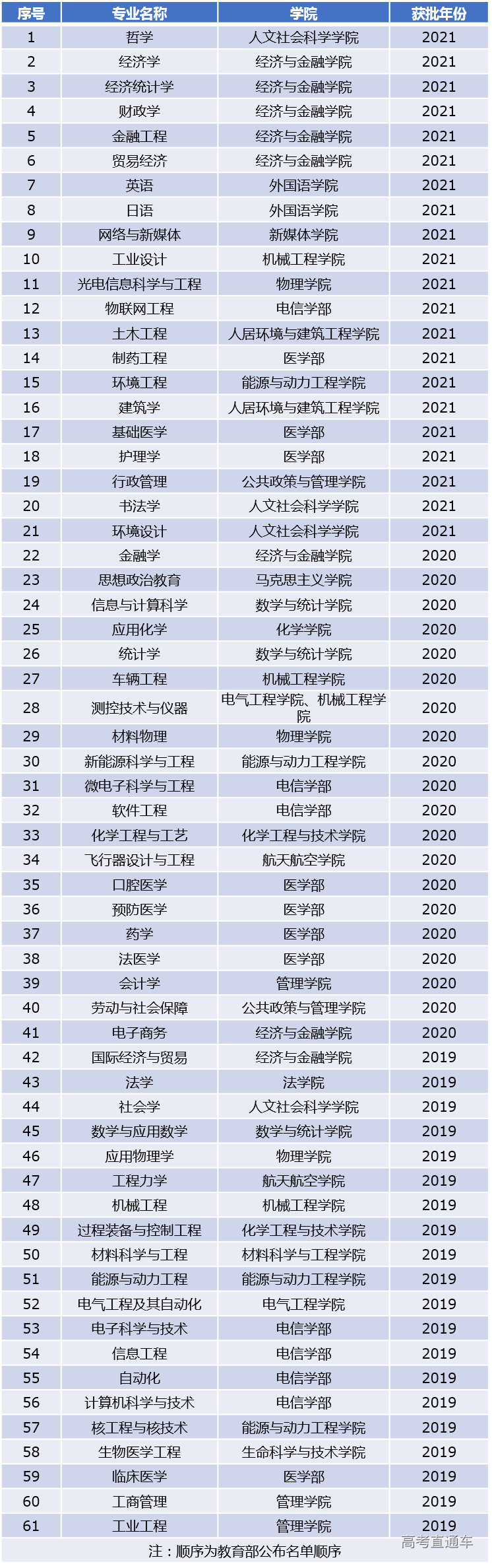 日前,教育部发布了《教育部办公厅关于公布2021年国家级和省级一流本科专业建设点名单的通知》,西安交大21个专业获批2021年度国家级一流本科专业建设点,入选专业数实现新突破。本批次是2019年、2020年后的第三批,西安交大累计有61个专业获批国家级一流本科专业建设点。符合申报条件的专业中国家一流专业占比95%,实现二级学院全覆盖,充分彰显了西安交大专业建设的显著成效。