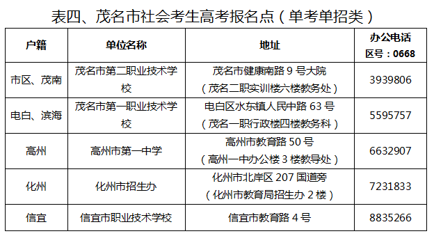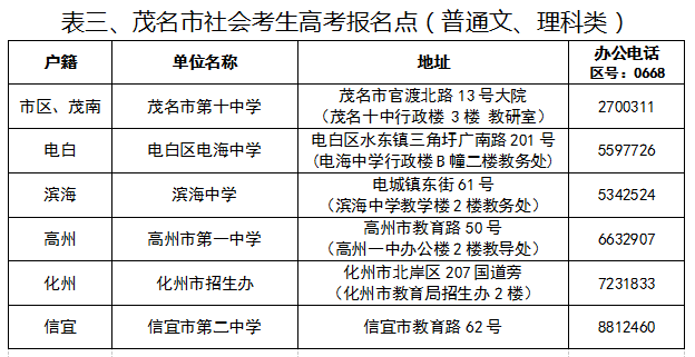 第二步:考生本人持区、县级市招生办开具的介绍信于5月5-7日(上午9:00-11:00;下午3:00-5:00)到指定报名点办理高考报名手续。我市指定社会考生报名点分两类,分别是:普通文理科类(见表三)和高职专业院校试点班和中国消防救援学院单独招生类(统称单考单招类,见表四)。