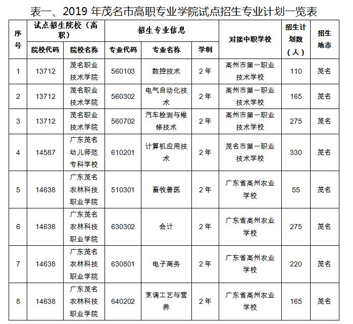 2.获得中职毕业学校或户籍所在地招生办公室(考试中心)推荐报考资格。中职学校应届毕业生由毕业学校推荐,中职学校往届毕业生由户籍所在地招生办公室(考试中心)推荐,考生只能报考设置在推荐单位所在地级市的高职专业学院,不得跨地市报考。我市试点院校、专业以及招生计划情况详见表一。