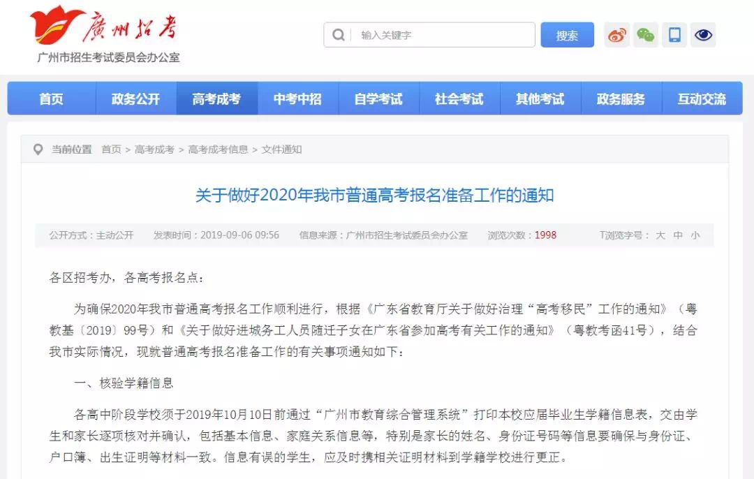 各高中阶段学校须于2019年10月10日前通过“广州市教育综合管理系统”打印本校应届毕业生学籍信息表,交由学生和家长逐项核对并确认,包括基本信息、家庭关系信息等,特别是家长的姓名、身份证号码等信息要确保与身份证、户口簿、出生证明等材料一致。信息有误的学生,应及时携相关证明材料到学籍学校进行更正。