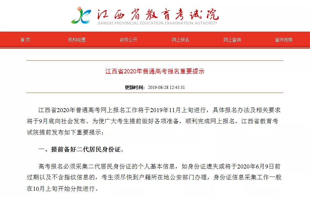 江西省2020年普通高考网上报名工作将于2019年11月上旬进行,具体报名办法及相关要求将于9月底向社会发布。