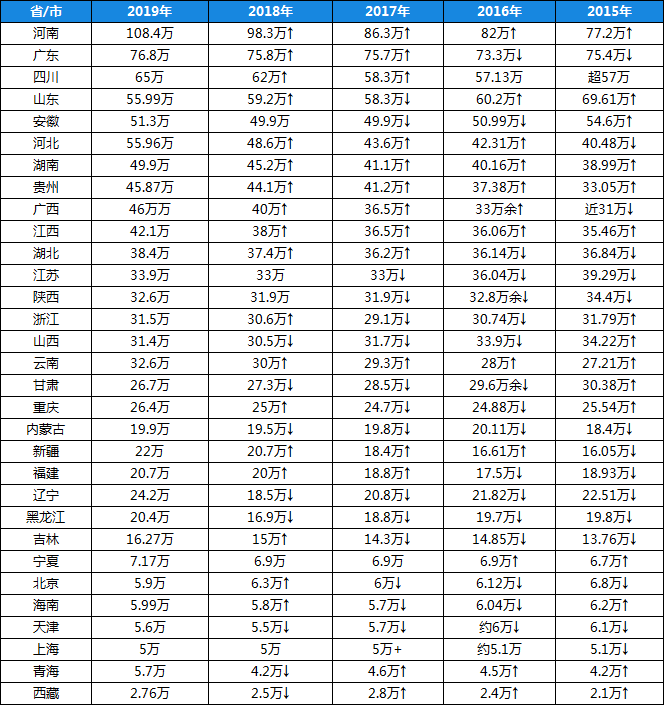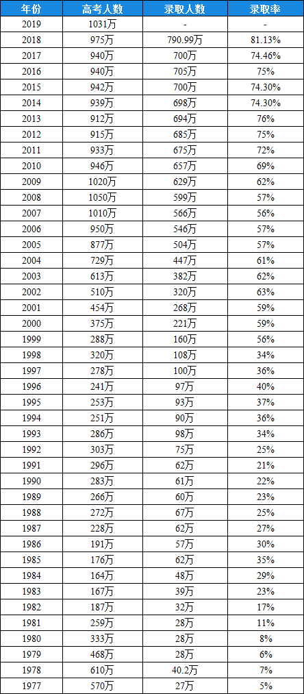 以下是历年高考报名人数及录取率情况,大家可以依此预测2020高考人数及录取趋势。