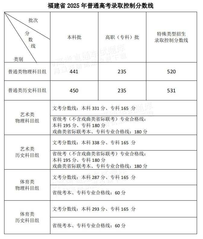 6月24日下午,福建省高等学校招生委员会召开全体会议,研究确定我省2025年普通高考切线方案,部署高招录取工作。经会议研究决定,福建省2025年普通高考各类录取控制分数线具体如下: