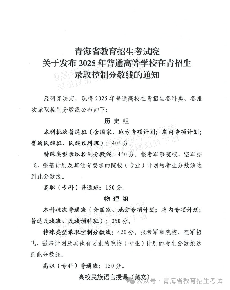 2025青海高考录取最低分数线公布:本科物理350历史405
