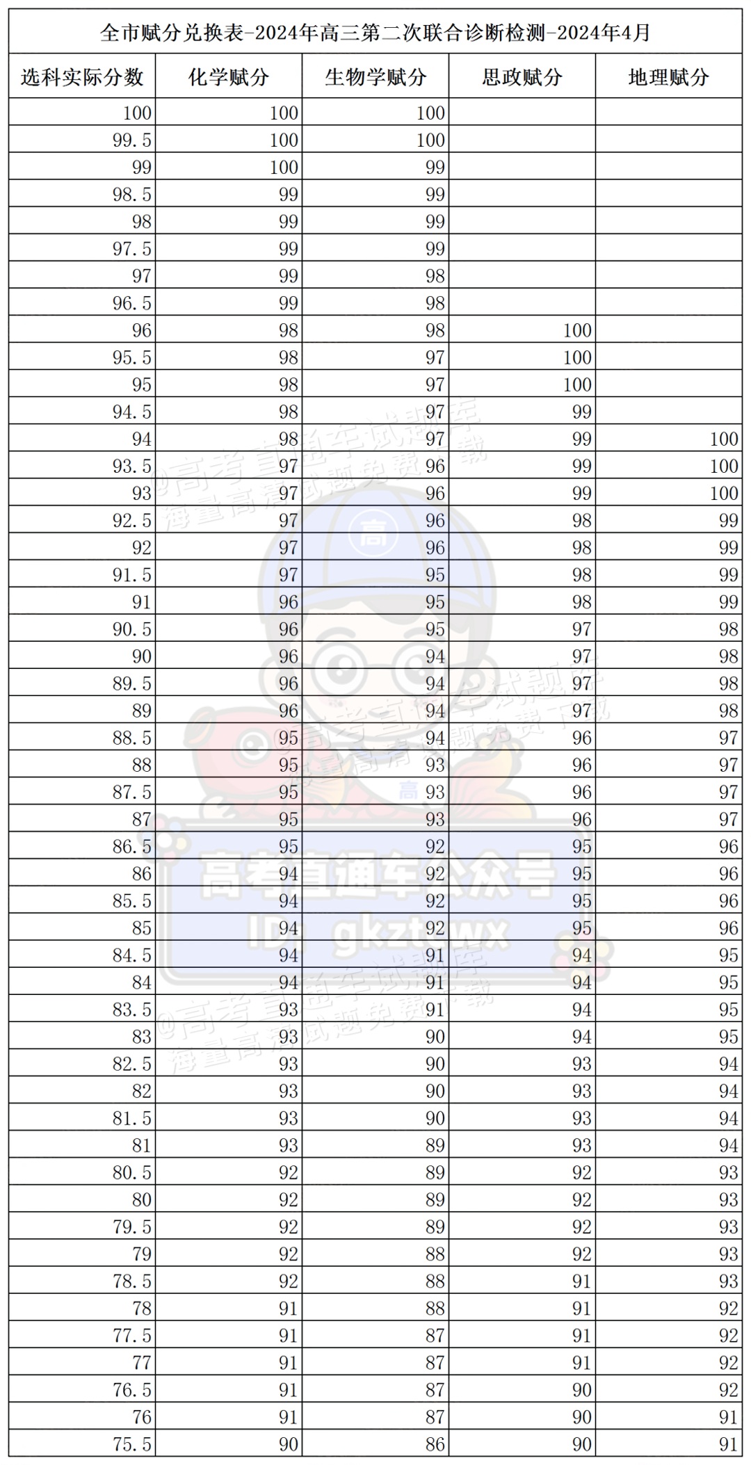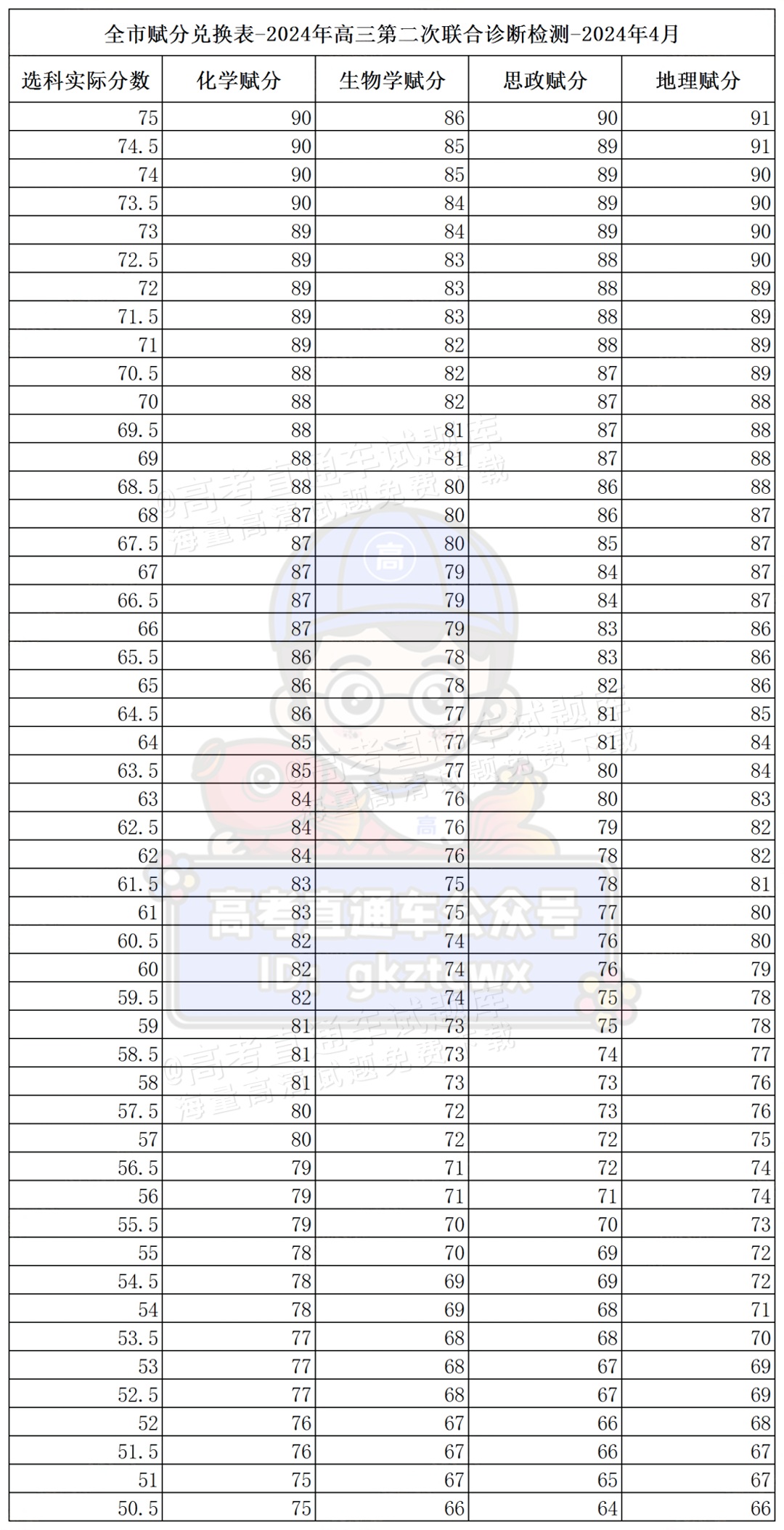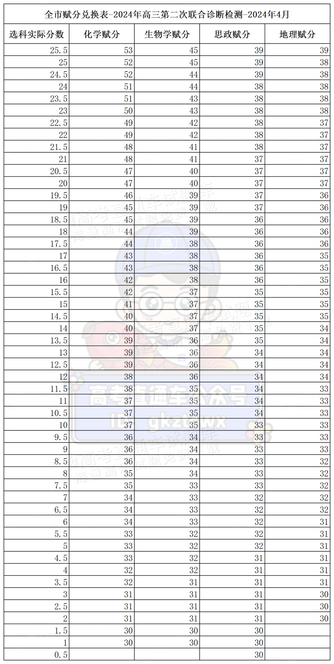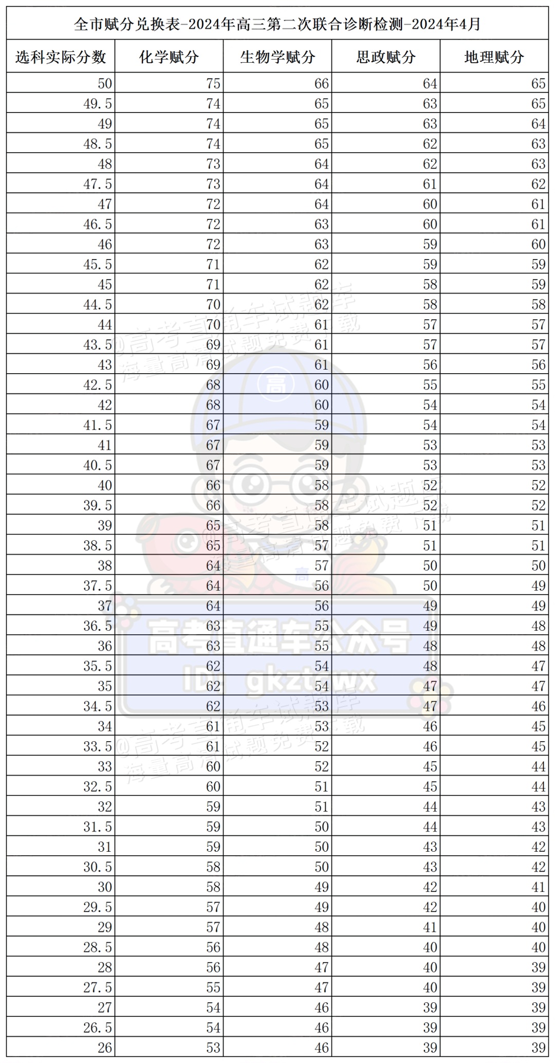 2024重庆二诊(康德卷)赋分表公布