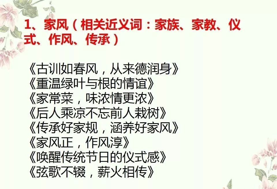 1.家风(相关近义词:家庭、家教、仪式、作风、传承)