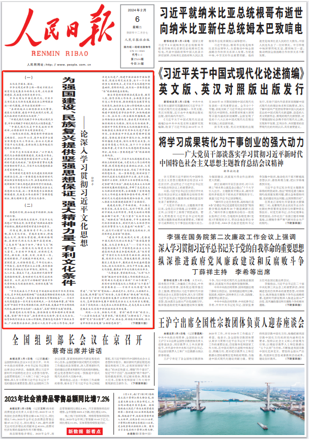 《人民日报》头版2月6日推出任仲平文章《为强国建设、民族复兴提供坚强思想保证、强大精神力量、有利文化条件——论深入学习贯彻习近平文化思想》。