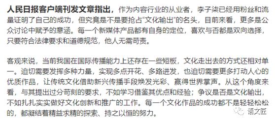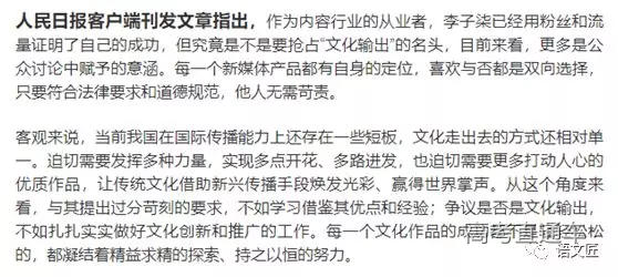 其次是基于李子柒的影响力。如今已是中国文化输出的时代,需要依靠媒体、影视、文化传播的大力宣传和包装,而李子柒作为一个自媒体人,尽管有说背后存在专业团队加持,但对于输出中国文化的能力依然存在着质疑,无法做到精准到位,自然难以担起泱泱中华五千年文明“文化输出”的重任。