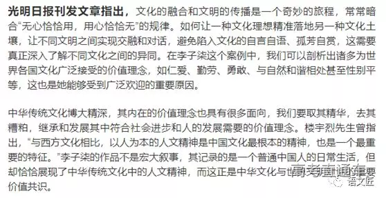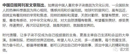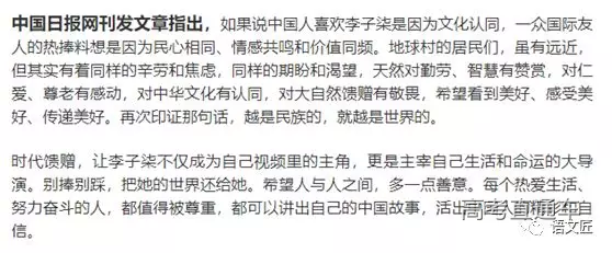 李子柒用自己的力量做到了由内而外、让人感动的文化输出,她的视频输出的是中华民族五千年来曾经影响世界的那些文化,包含的是最精华、最珍贵的精神内核,这不就是讲好中国故事的绝佳代表吗?而批判李子柒的人,恰恰是一种狭隘的思想。中华文明绵延至今,种植始终都是老祖宗传下来的东西,我们现在城市里享受的一切便利,大家吃的每一口大米饭,吃的每一颗新鲜蔬菜,不都是农民种出来的吗?李子柒展现出的农业文化,源于生活却又给我们带来了美的感受,让我们明白了田园牧歌的美好,让每个人都能够认同,这就是文化输出。