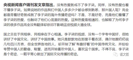 随着中国经济愈加发展,世界各地民众对中国文化的兴趣愈加高涨。以生动的形式呈现优秀的文化,以真实的情感打通各国民众共通的心灵,是最好的对外文化传播。向世界有效地呈现中国文化之美,我们需要更多的李子柒。