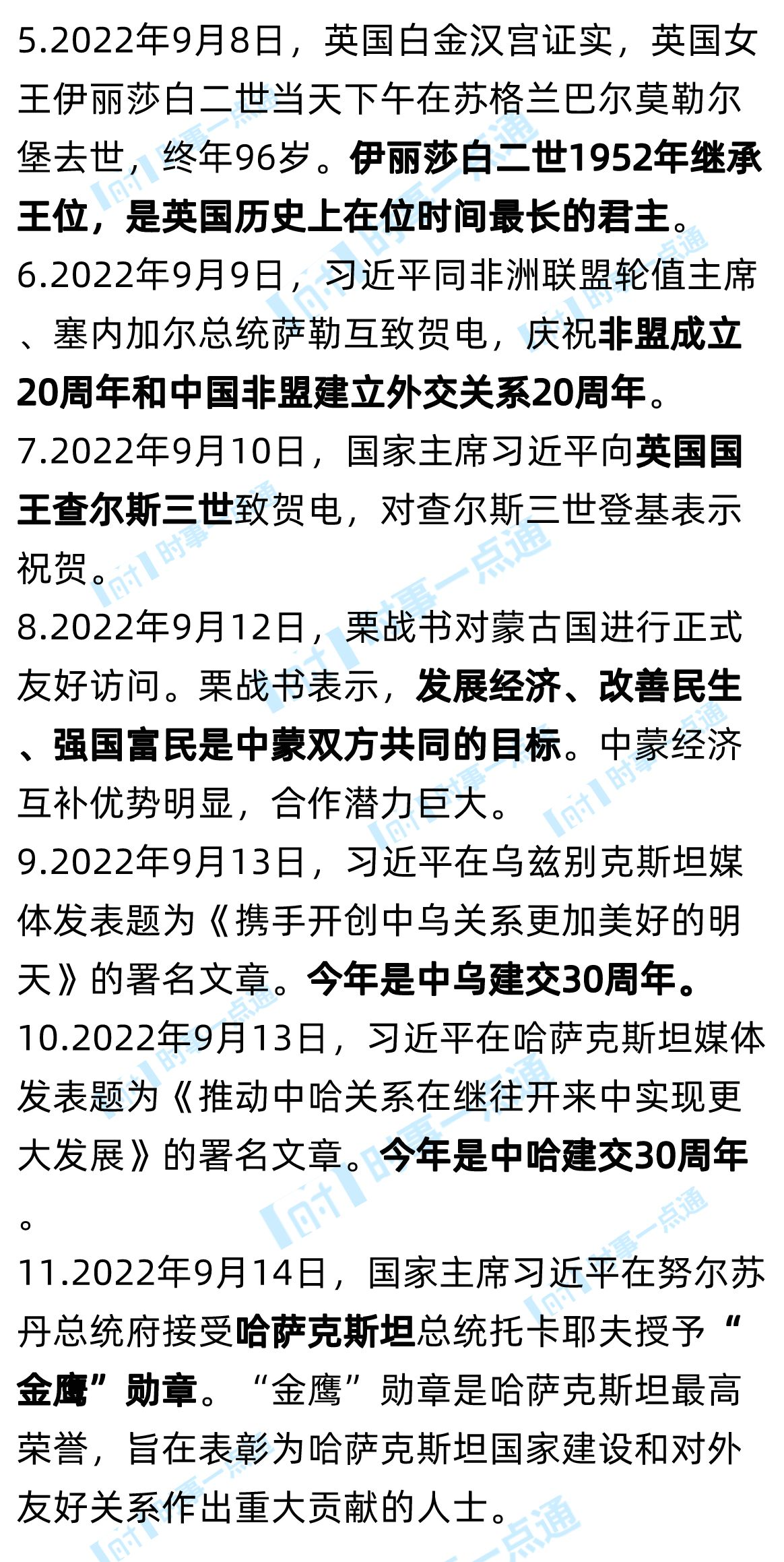 3. 2022年9月5日,英国外交大臣伊丽莎白·特拉斯当选执政党保守党新党首,在获得女王伊丽莎白二世批准后将接任英国首相。