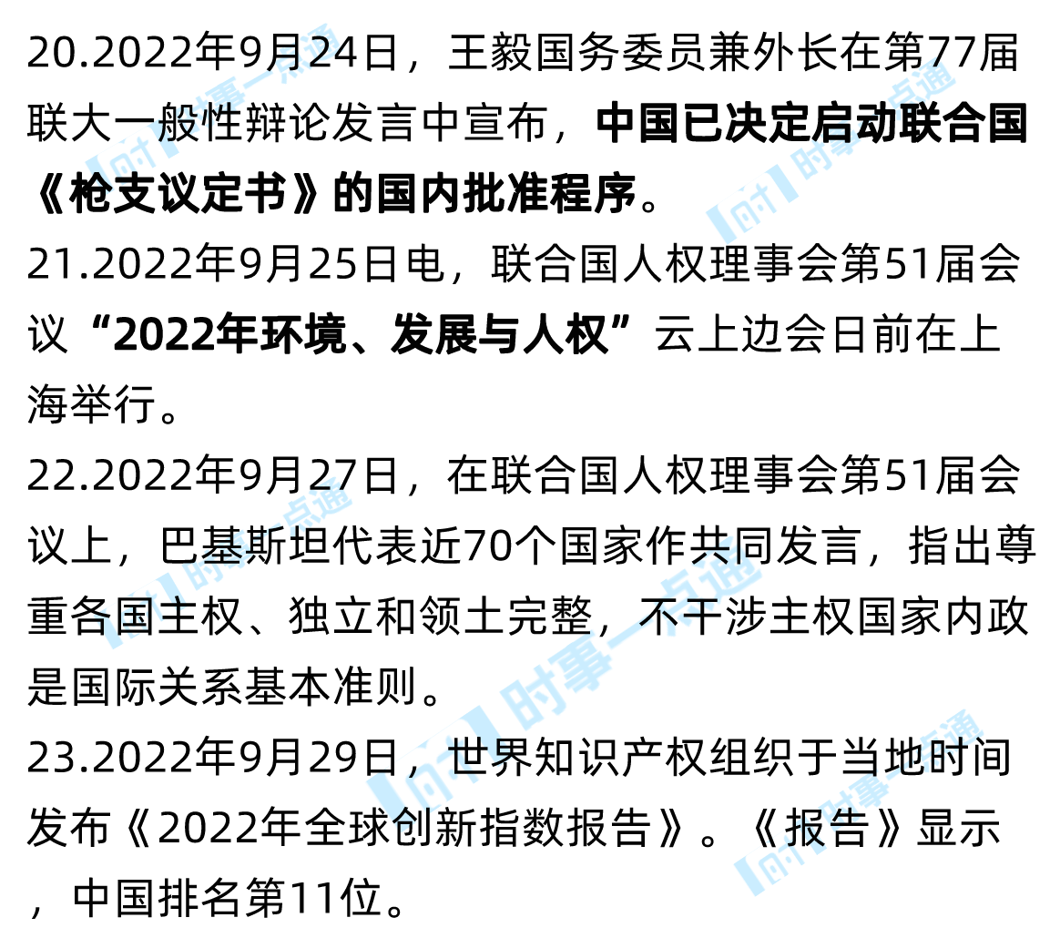 1. 2022年9月1日,王毅以视频方式出席纪念《联合国海洋法公约》开放签署40周年国际研讨会开幕式。王毅指出,重温《公约》缔约历程、宗旨目标及履约实践,对当前全球海洋治理具有重要启示:一是弘扬多边主义;二是促进公平正义;三是坚持开放进步。