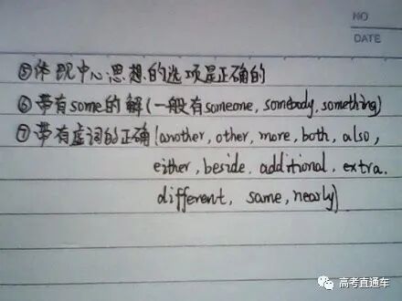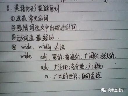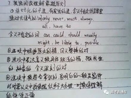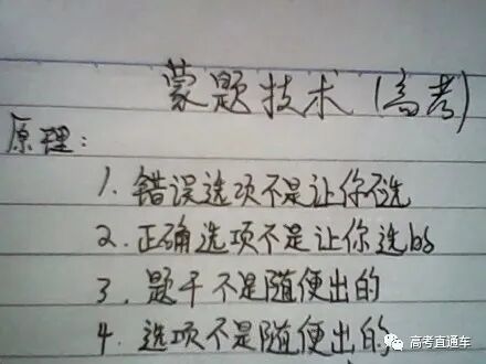 比如一道题问:下列关于密度的说法中,错误的是哪一个?答案选项中,有两个这样的选项:这就可以看出,一定其中有一个是错误的——哎,你先别笑!有很多的题中,都会有矛盾的地方。只要找出矛盾,再蒙的几率就大多了。 这个所谓“蒙感”,就是这蒙题的感觉。所有考试的人都知道,选择题中选择B、C选项的占绝大多数。所以遇到不会的题,就往B、C上靠,几率会大一点。 五题中不能都选同一个选项,如都选AAAAA、BBBBB、CCCCC、DDDDD。一般有三个字母组成如AAACD、BCCAA、DABCD。听力提前翻译材料,根据给的选项可以提前预测一下内容。高考听力我感觉不会很难,但是内容会比较曲折,一般材料中出现的第一个答案一般不是正确的,建议集中注意力好好往下听,不要着急落笔,可以在旁边记一点东西。建议先看一遍文章大概了解文章内容再开始做题。不建议那些三长一短什么的蒙题,你肯定不能离开原文。建议带着问题看原文,找找信息点,就是文章和答案重合的那部分,一般都是转换了方式去说,a篇b篇很简单。到cd两篇就比较有难度,可以把d篇最难的放在最后做,第一是节省时间,第二是给自己比较积极的心理暗示。现在英语有了主观题,反正积极正能量的答案,肯定正确。答案项中有绝对语气词的一般不是正确答案项。这些语气词有:must,always,never,the most,all, only,have to,any,no,very completely, hardly等。选项中含有不十分肯定的语气词一般是正确答案项。这些语气词有:can,could,may,should, usually,might,most,more or less,relatively,be likely to,possible,whether or,not necessarily等。选项中照抄原文的一般不是答案项,而同义替换的一般是选项。选项中表达意义较具体的、肤浅的一般不是答案项,而概括性的、抽象的、含义深刻的是答案项。选项中较符合常识的,易明白的一般不是选项;而似乎不太合理,一时较难理解的往往正确。总而言之,从语言精确度原则出发。把英语当成语言而不是学科。英语的本质是用以沟通、展示信息。而不要当成一门研究用的学科。英语的语言特点是客观、精确,不是由词来决定句子,而是由句子来决定词汇,因此,答题时一切从表达意思出发。水平不够时(单词量少、语法不好)如何阅读?把陌生词用A、B、C、D或其他符号替代,根据所在位置大概判断它是“东西”还是“动作”,标示即可。能够读懂的就尽量读懂,读不懂的放着,根据选项来判定。比较选项:英语选择题明确说明选出一个最佳选项而不是得出正确结论,因此,选择出错可能最小的选项,哪怕你什么意思都看不懂,但是从选项中,把带有十分肯定、否定的句子先排除,把虚、大、全的选项留下。英语阅读中的文章主旨大意题的范围最大原则就是如此产生的。- 其内容太窄,不能覆盖全文内容,只是文章内容的一部分,或只是文章内容的一个细枝末节;