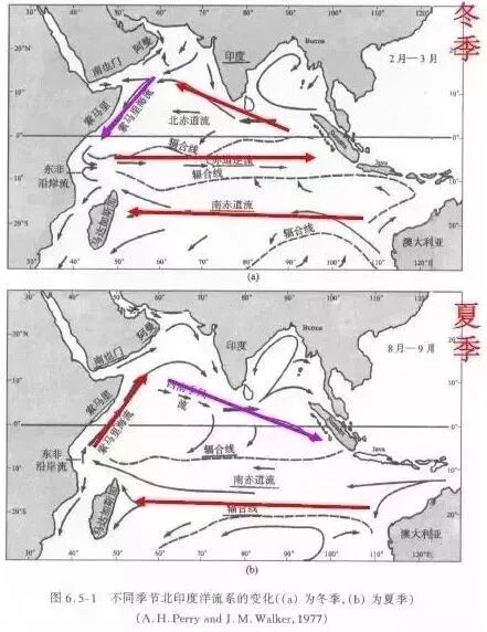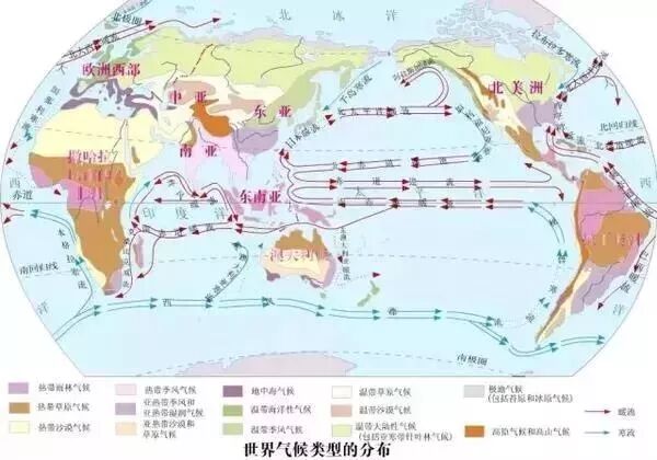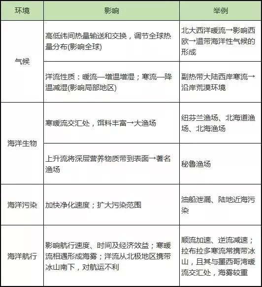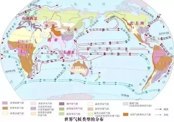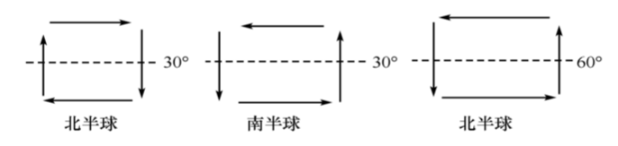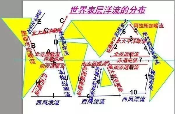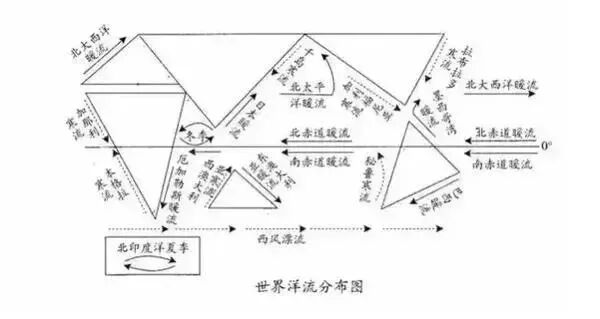 洋流是地球上热量转运的一个重要动力。洋流调节了南北气温差别,在沿海地带等温线往往与海岸线平行就是这个缘故。海洋下垫面的性质是不均一的,其差异主要表现在冷、暖洋流上。洋流是历年考试的重点,希望同学们多加练习、记忆! 洋流分类 1、按成因 洋流按成因分为风海流、密度流、补偿流三种。 风海流:形成动力为大气运动,规模很大。例如,西风漂流、信风带内的洋流。 密度流:由密度差异引起,多出现在封闭海域与外洋之间。例如,地中海与大西洋之间、红海与印度洋之间。 补偿流:分为水平流和垂直流,多在大洋两岸。例如,赤道逆流、秘鲁寒流。 2、按性质 洋流按性质分为暖流、寒流两种。 暖流:从水温高的海区流向水温低的海区,多由低纬流向高纬或为下降流。典型的有,日本暖流、墨西哥湾暖流。 寒流:从水温低的海区流向水温高的海区,多由高纬流向低纬或为上升流。典型的有,千岛寒流、拉布拉多寒流。 3、按地理位置 洋流按地理位置分为赤道流、大洋流、极地流、沿岸流四种。 赤道流:分布于赤道附近海区。例如,南北赤道暖流、赤道逆流。 大洋流:分布于大洋中心,这种洋流类型较多。 极地流:分布于极地海域。例如,南极绕极流。 沿岸流:分布于沿海海域,受陆地影响大。例如,我国的沿岸流。 影响洋流分布的因素 盛行风是海洋水体运动的主要动力,海水在盛行风的吹拂下,形成规模很大的洋流,因此洋流的流向和分布与地面风带模式及其分布有着密切关系。 除了盛行风以外,还有海陆分布、地转偏向力等因素,它们共同作用,形成了实际的大洋洋流分布,如下图。 洋流的分布规律 1. 在热带和副热带海区(中低纬度),形成了以副热带海区(30°)为中心的大洋环流,北半球呈顺时针方向流动,南半球呈逆时针方向流动。 2. 在中高纬度海区,形成了以60°为中心的大洋环流,北半球呈逆时针方向流动。 3. 在南极大陆的周围,陆地小,海面广阔。南纬40°附近海域终年受西风影响,形成西风漂流(寒流)。 4. 北印度洋海区,受季风影响,冬季洋流呈逆时针方向流动;夏季洋流呈顺时针方向流动。 重要的洋流 太平洋:北太平洋暖流、日本暖流(黑潮)、千岛寒流(亲潮)、加利福尼亚寒流、秘鲁寒流、东澳大利亚暖流 。 大西洋:北大西洋暖流、墨西哥湾暖流、拉布拉多寒流、本格拉寒流、加那利寒流、巴西暖流。 印度洋:西澳大利亚寒流、北印度洋季风洋流。 环球:西风漂流(寒流)。 洋流对地理环境的影响 洋流的应用 判断洋流流向的方法 1. 洋流成因法:根据洋流分布与气压带、风带之间的内在联系判断。西风带影响的洋流大致自西向东流;信风带影响的洋流大致自东向西流。 2. 洋流性质法:水温低于所流经海区的洋流是寒流,水温高于所流经海区的洋流是暖流;一般寒流由较高纬度流向低纬,暖流由较低纬度流向高纬。 3. 海水等温线弯曲法:等温线凸出的方向就是洋流的流向。 4. 地理位置法:中低纬大洋东岸洋流流向低纬方向,西岸洋流流向高纬方向;北半球中高纬大洋东岸洋流流向高纬方向,西岸洋流流向低纬方向。 判断洋流寒暖性质的方法 1.依据海水等温线的弯曲判断:等温线凸向较高纬度为暖流,凸向较低纬度为寒流。 2.依据洋流沿岸的环境特征判断:中低纬地区的沿岸出现荒漠景观,说明受寒流影响;出现湿热的森林景观,说明受暖流影响。 3.依据天气现象判断:常年多海雾天气现象的海域一般受寒流影响。 4.依据海陆位置判断:中低纬度海区,大洋东岸(大陆西岸)为寒流,大洋西岸(大陆东岸)为暖流。北半球中高纬度海区,大洋东岸(大陆西岸)为暖流,大洋西岸(大陆东岸)为寒流。 如何确定南、北半球 根据纬度与环流方向判定:第一步:根据纬度(30°或60°)确定海区(副热带或副极地海区);第二步:根据洋流方向(顺、逆);第三步:套用表层洋流分布图。 洋流判断中的应用技巧 1. 依据中低纬海区洋流的环流方向确定南北半球。顺时针方向流动的大洋环流在北半球;逆时针方向流动的大洋环流在南半球。 2. 依据西风漂流的性质确定南北半球:北半球的西风漂流为暖流,南半球的西风漂流为寒流。 3. 依据北印度洋海区的洋流流向确定季节:洋流呈顺时针流向时为北半球夏季,呈逆时针流向时为北半球冬季。 4. 洋流与等温线疏密:洋流交汇处等温线密集;洋流背向流动处,等温线稀疏。 5. 洋流与渔场:有渔场的海区可能是寒暖流交汇处,也可能有上升补偿流。 经典例题解析 下图为部分海区洋流分布示意图。读图完成(1)—(2)题。 (1) 下列关于图中洋流的叙述正确的是() A.如果①洋流自北向南流动,则①洋流为北半球寒流 B.如果②洋流自南向北流动,则②洋流可能为日本暖流 C.如果③洋流自西向东流动,则③洋流可能为北大西洋暖流 D.如果⑥洋流自南向北流动,则⑥洋流可能为南半球暖流 (2) 如果图b中大洋环流呈顺时针流动,则甲、乙、丙、丁四处中能够形成大渔场的地区及渔场形成的原因叙述正确的是() A.甲处,寒暖流交汇形成渔场 B.乙处,有寒流(上升补偿流)经过形成渔场 C.丙处,位于浅海大陆架,光照条件好 D.丁处,海水温暖,有利于形成大渔场 解题思路: (1)