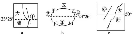 如果②洋流自南向北流动,则该环流为北半球中低纬度环流,②洋流可能为日本暖流;如果①洋流自北向南流动,则①洋流为南半球大陆东岸的暖流;如果③洋流自西向东流动,则此环流为南半球中低纬度环流,③洋流可能为西风漂流;如果⑥洋流自南向北流动,则⑥洋流可能为北半球中高纬度大陆西岸的暖流。 (2) 如果图b中大洋环流呈顺时针流动,则该环流为北半球中低纬度大洋环流,易形成渔场的地区为甲处,因甲处有暖流和寒流交汇。 参考答案: (1)B (2)A