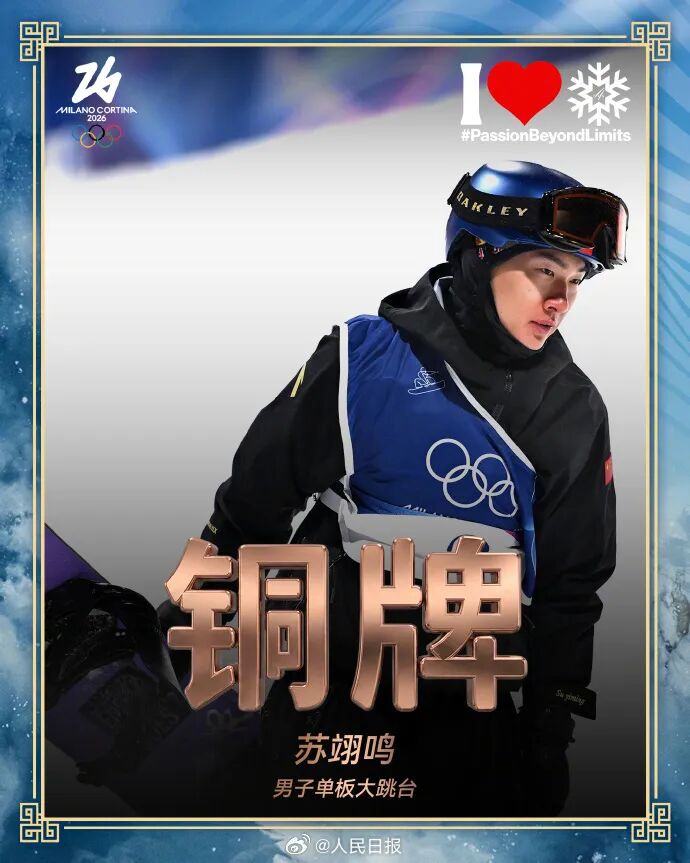 北京时间2月8日,在单板滑雪男子大跳台决赛中,苏翊鸣获得铜牌,为中国军团赢得了在本届冬奥会上的首枚奖牌。