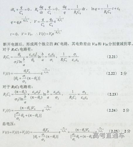评析:带损耗的半圆柱形电介质,需要考虑漏电流。实际阅卷情况五十余人满分,六十余位零分,区分度高、成绩差异大,模型并不复杂,想明白之后求解很简单。关键在于电流连续性、电导的计算(用电导计算比用电阻简单)以及等效电路图模型的建立(注意两个不同的特征时间)。