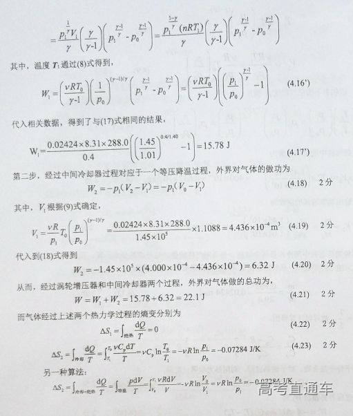 评析:本题涉及热学中的多数主流考点,包含理想气体状态方程、绝热过程、等压过程、熵变,思维难度不大,但涉及到较多的数据计算。总体比较简单,平均分较高,但阅卷时发现很多高分学生本题得零分。
