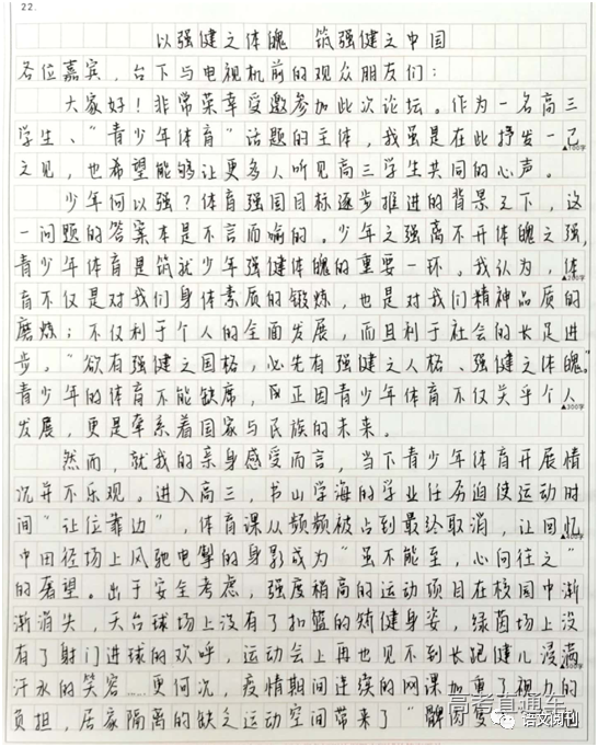 不足:“你们”所指不太明确,如果是指学校,那第二个主体段解决问题的办法中嘱咐孩子们重视学习的同时多参与体育锻炼,就不符合对象。没有兼顾到现场其他嘉宾和电视机前的观众,全文带着“嘱托”写,但是忽略的家长自己可以做些什么,现场把控的分寸感还要加强。