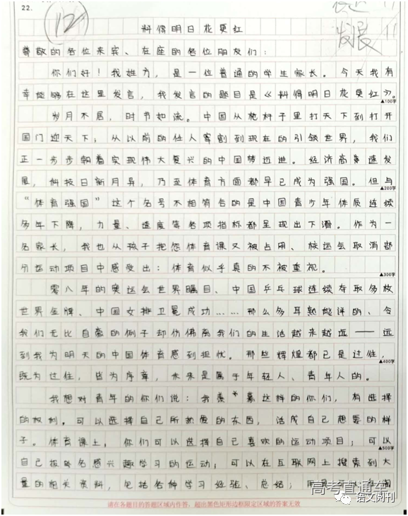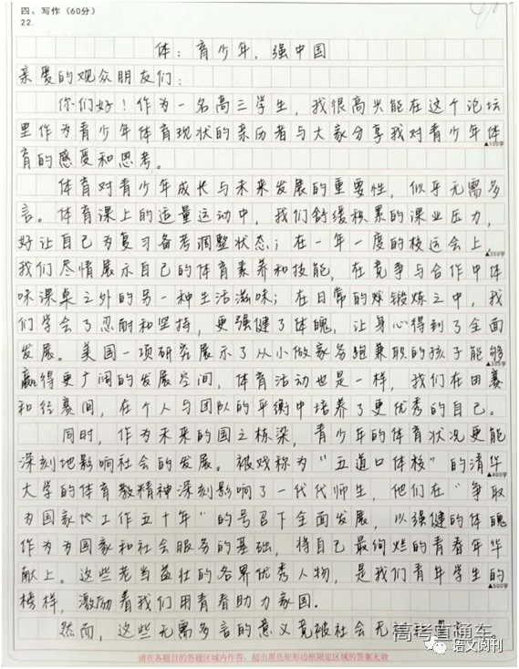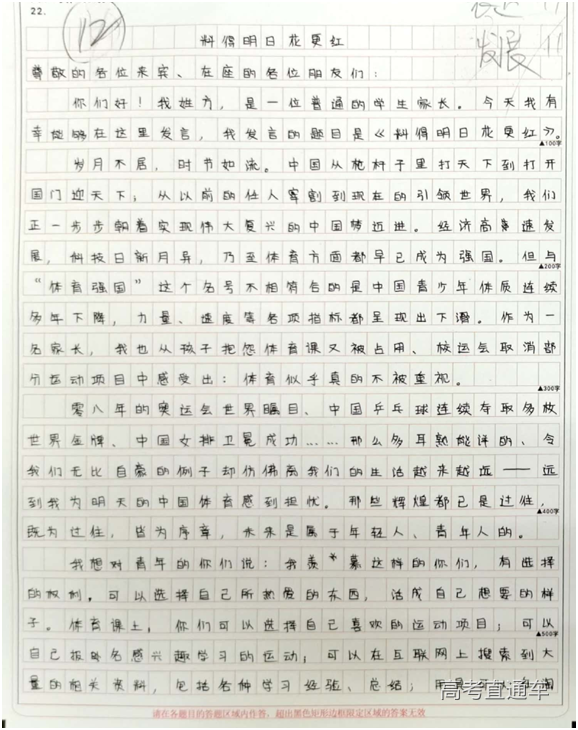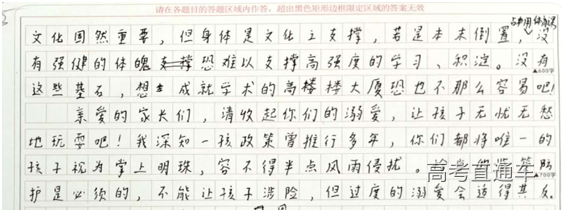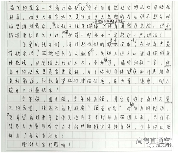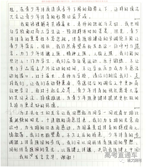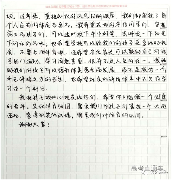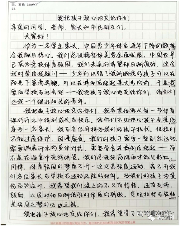 本文“三合”做的比较好,尤其是家长身份贴合,以一个殷切希望的家长身份,嘱咐学校“我把孩子放心地交给你们”,希望培养出一个阳光健壮的青年,感情深沉。同时结合材料情境,谈孩子体育健康的重要性,更重要的是主要提出了解决问题的办法:一是嘱咐学校重视体育课,让孩子们多运动;二是嘱咐孩子们重视学习的同时多参与体育锻炼。最后提出希望,强化少年和体育强国的关系。全文符合家长身份,代入感强,有情境意识,突出“怎么做”。