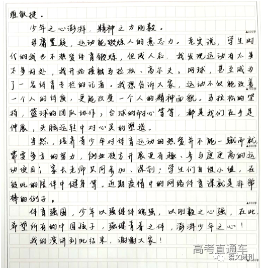 本文以“青少年体育”为中心写作,中心明确,符合题意。第二段以自己的切身体验写校园体育,真切可感。第三段把“青少年的体育状况”与国家未来、社会发展联系起来,确立了写作的思想高度。第五段“亲爱的爸妈和老师,各位关怀青少年的叔叔阿姨们”,既突出了发言者的身份,也与现场进行了互动。写作中,“校园体育”比较突出。