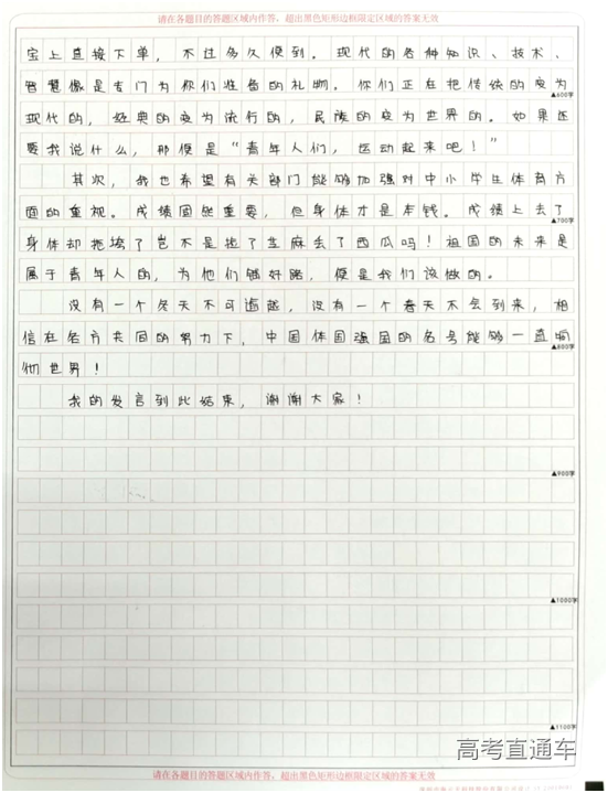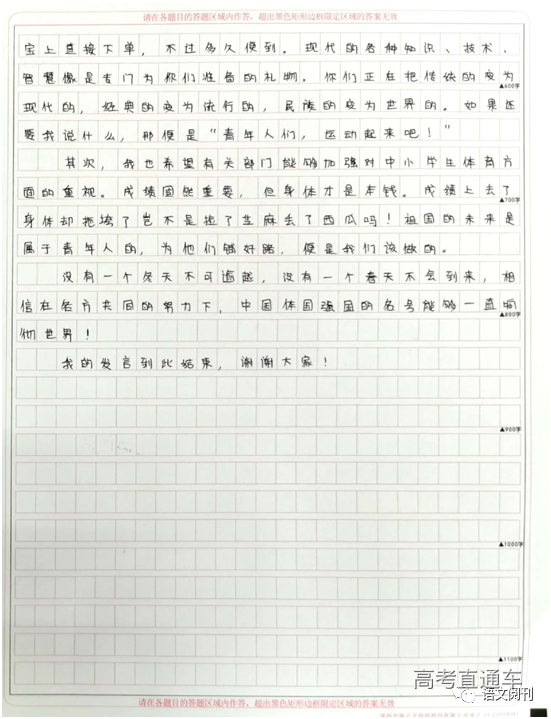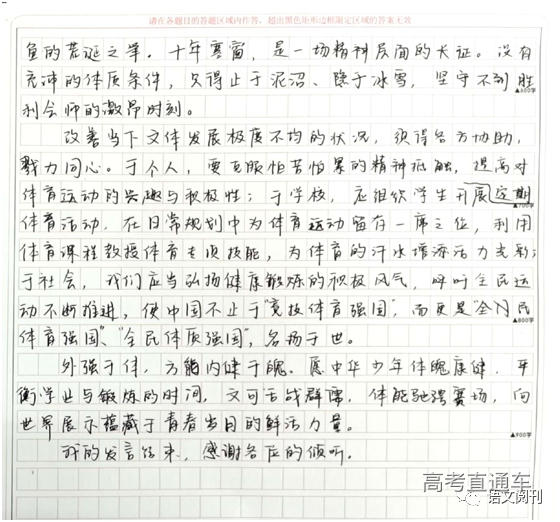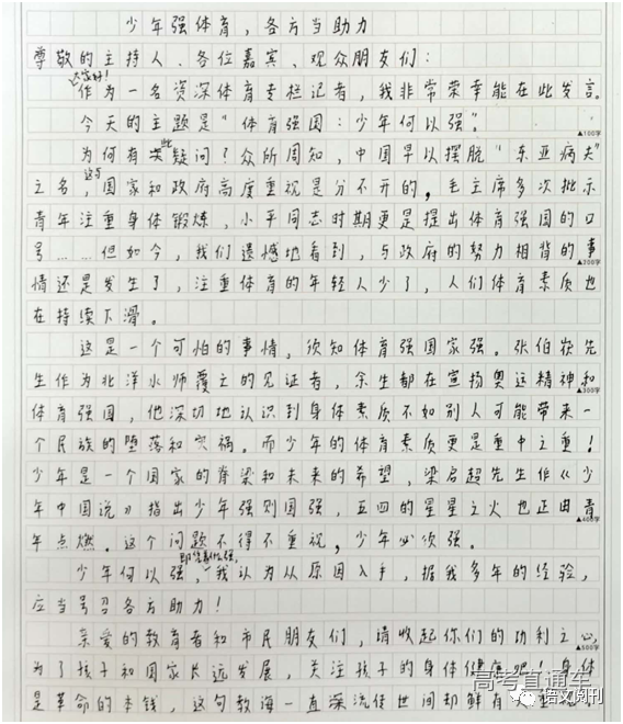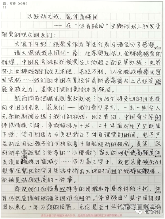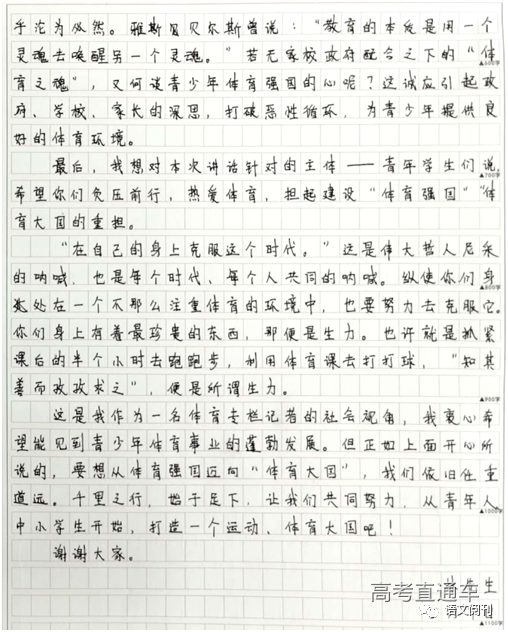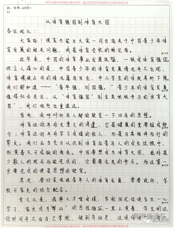 不足:命题者强调的是“体育强国”,不要自己再生造一个“体育大国”的概念;要认识到现在我们已经是竞技体育强国,但是不是体育强国;三种解决问题的角度可以再落实具体些,更有说服力;记者身份体现再明显一些;结尾不需要落款和日期,格式扣1分。