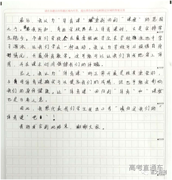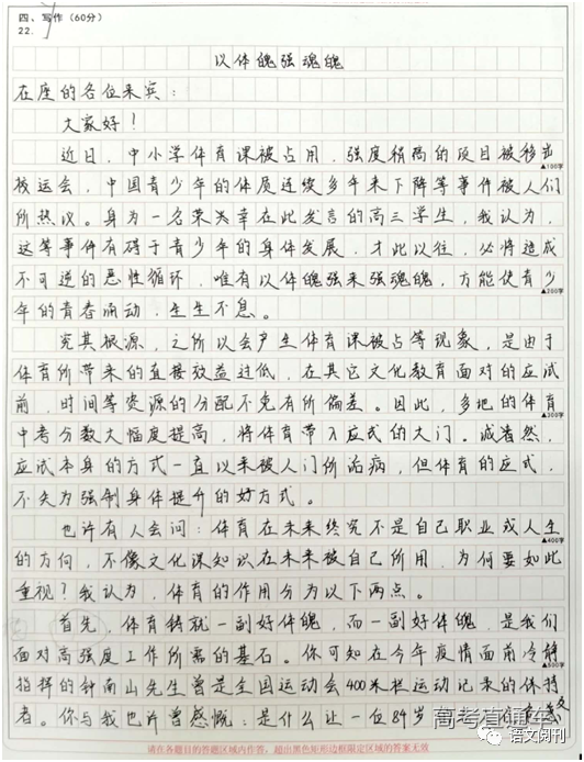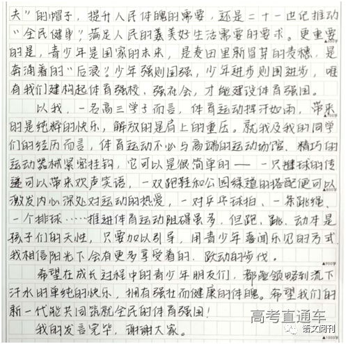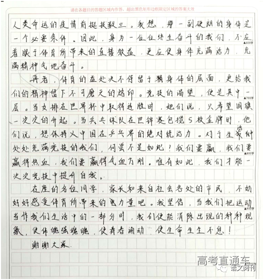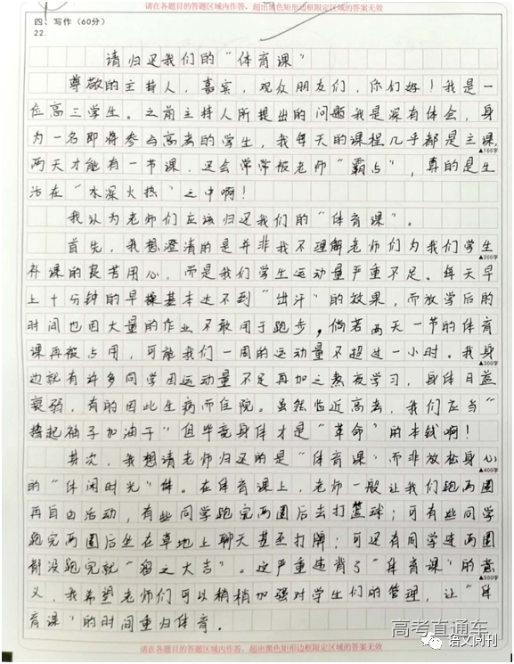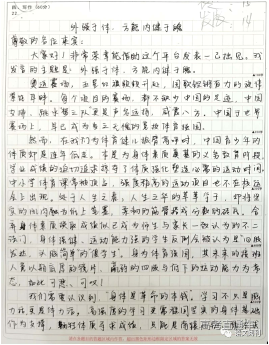 文章符合题意,提出了用提高体育应试分数的方法来强制进行体育运动,提升身体素质。重点分析了重视体育锻炼的原因和意义,并向学生、家长和其他市民提出了希望。有明确的写作身份和写作背景、交际对象和内容。
