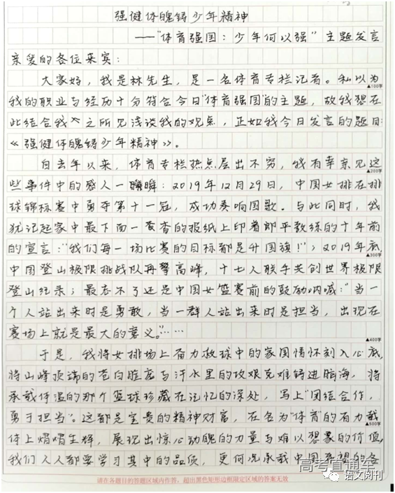 首先标题扣住“体育强国”题眼。开头点明记者身份和发言主题。第二段指出竞技强国和中国青少年体育现状的冲突,引发“中国由体育强国到体育大国任重道远”的思考。接着考生从三角度提出解决问题的办法:一是转变旧有思想,体育运动很重要,需要全民参与运动;二是需要政府、学校、家长等协同合作;三是青少年要负压前行,热爱体育。最后以一个体育栏目记者身份再次强调青年运动的重要性,并提出希望。全文结合材料,中心突出,重心在写如何做才能“少年强”,扣住少年和体育强国的关系,符合记者身份,代入感强,有情境意识。