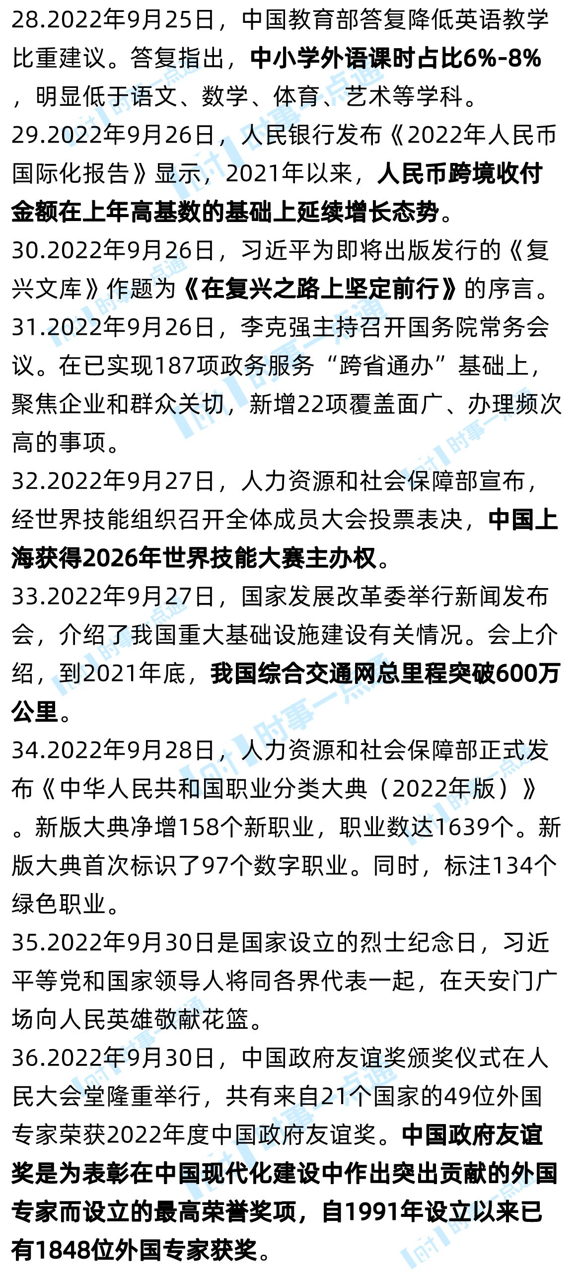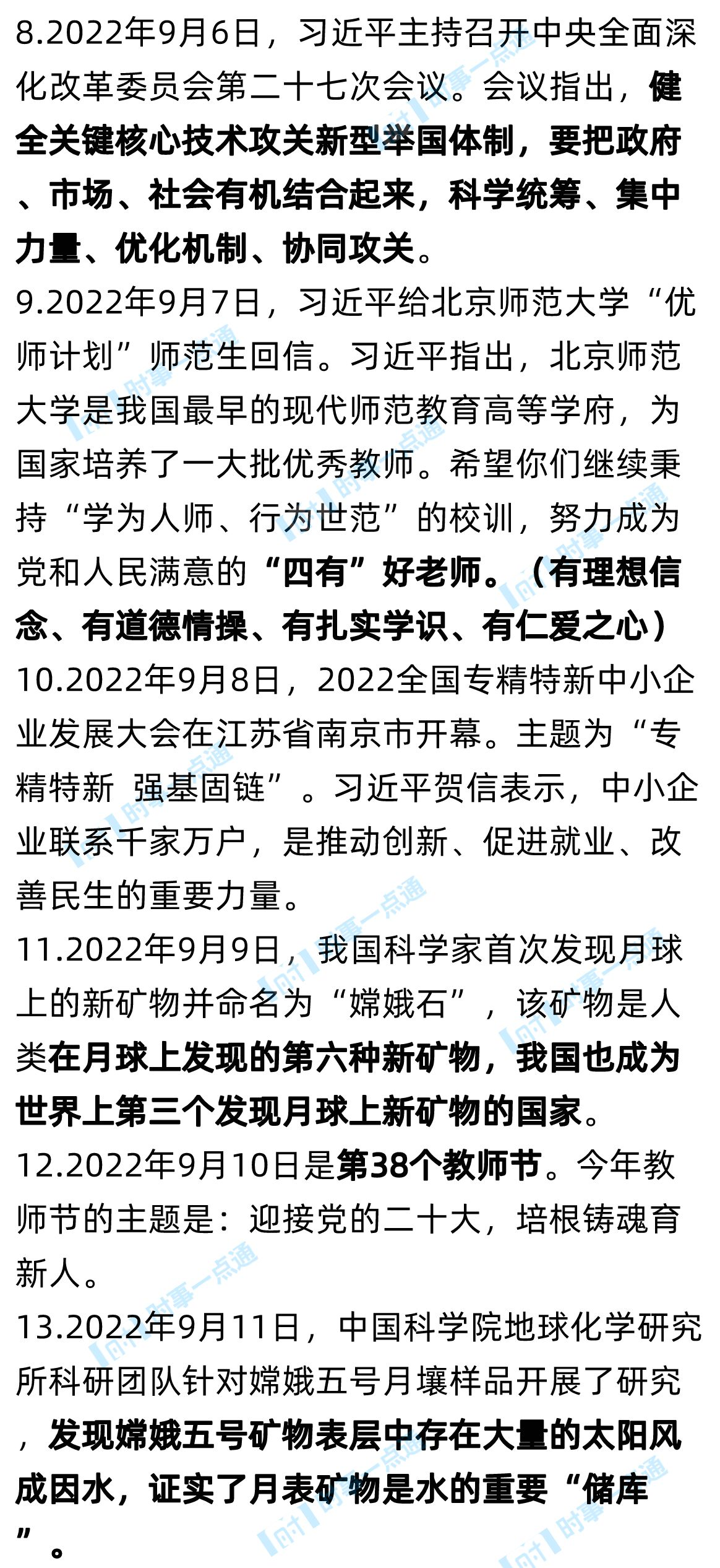5. 2022年9月3日,《教师教育蓝皮书:中国教师教育发展报告(2022)》发布,这是国内第一本教师教育蓝皮书。蓝皮书指出,我国教师队伍规模世界第一,建成了世界最大规模的教育体系,总体教育水平进入世界中上行列;不断发展并完善教师教育一体化,纵向打通了教师职前、入职和职后教育培训的全环节和全过程,横向实现了普通高校、师范院校、教学科研机构、中小学、社会教学机构和地方政府的有效联结。