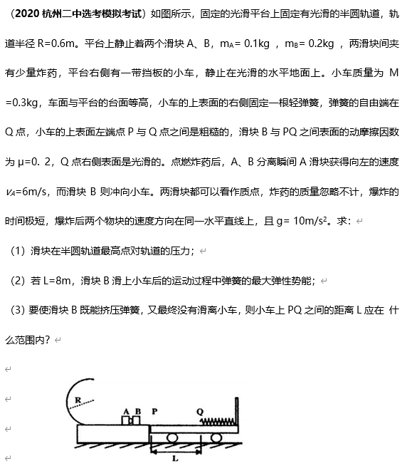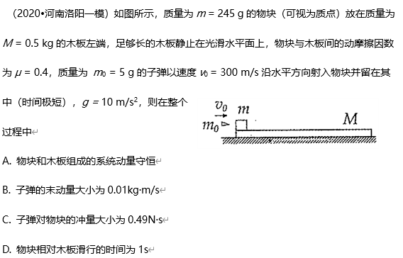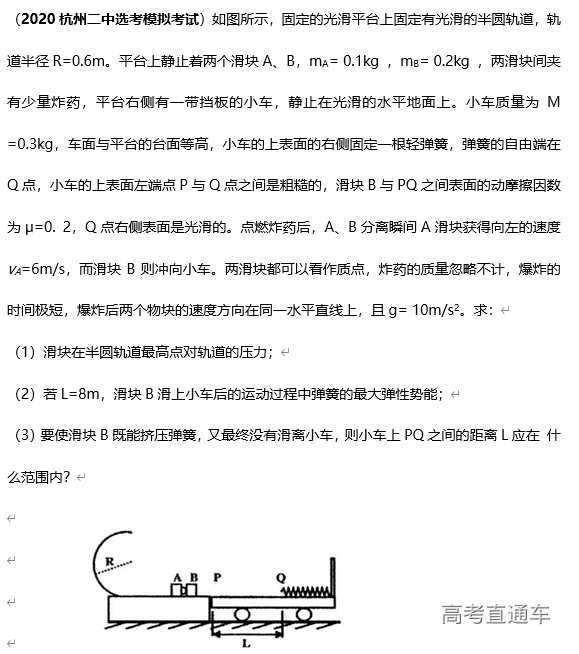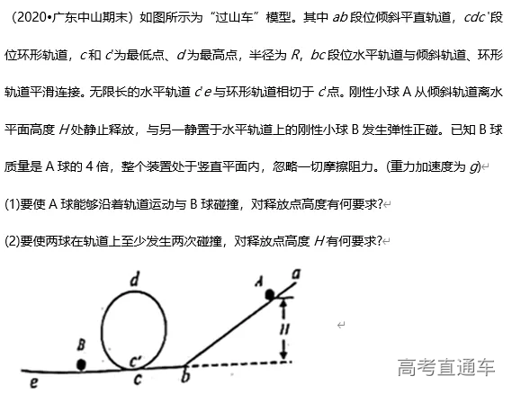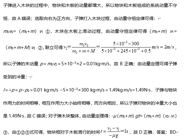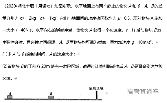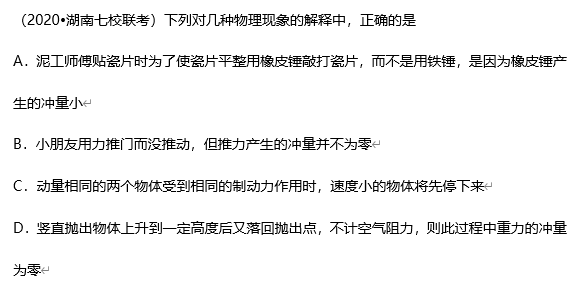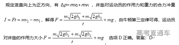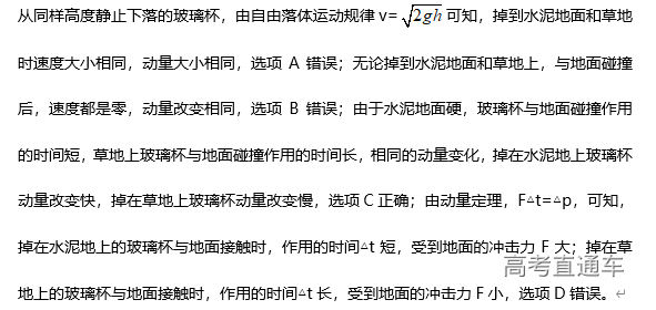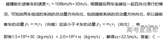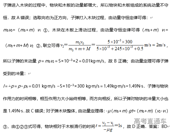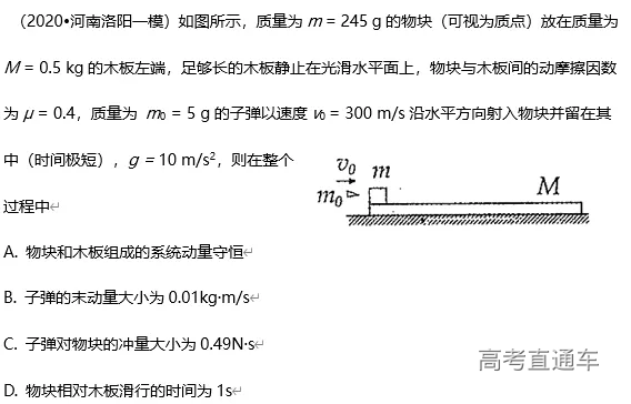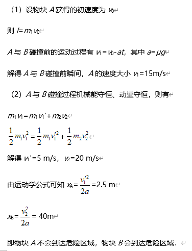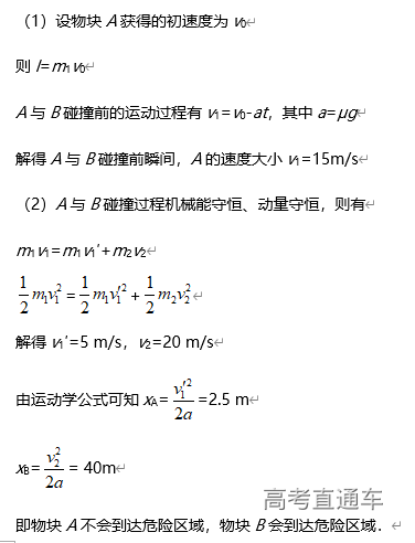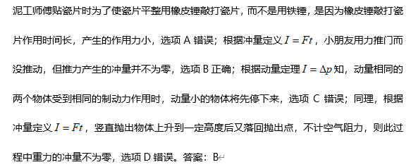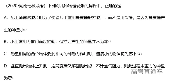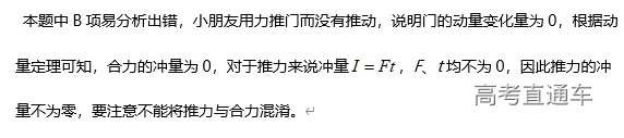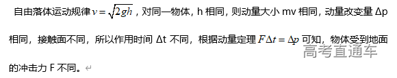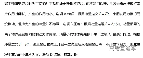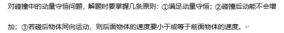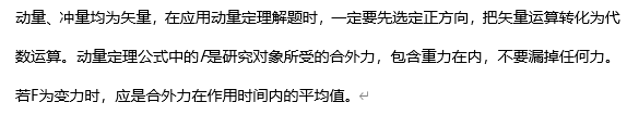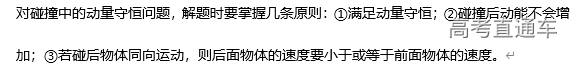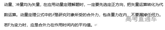 命题热点一:结合生活现象考查动量定理的简单应用 生活中经常会遇到用动量定理求平均冲击力的问题,比如分析高空抛物的危害,物体制动的情况以及体育运动中球类的冲击力等,由此设置的试题与高考中越来越关注“分析解决实际问题”思想是一致的,符合当前命题趋向。 例1 答案:B 解析: 刷有所得: 例2 答案:C 解析: 刷有所得: 例3 答案:D 解析: 刷有所得: 命题热点二: 联系生活实际考查动量守恒定律的简单应用 教材例题和高考题、模拟题中都加重了试题与实际的联系,命题导向由单纯的解题向解决问题转变,对于动量守恒定律这一重要规律我们也要关注其在生活实际中的应用,学会建构模型、科学推理。 例4 答案:C 解析: 刷有所得: 例5 答案:A 解析: 刷有所得: 选定正方向,确定初、末状态的动量,根据动量守恒定律列方程求解即可。 例6 答案: 解析: 刷有所得: 严格意义上讲只有在系统所受合外力为零的情况下系统的动量才守恒。若发生碰撞的时间极短,可以近似认为系统满足动量守恒,这是一种近似处理问题的方法。若合外力不为零,但是在水平方向上合力为零,可以在水平方向上应用动量守恒定律。 命题热点三: 动量与能量综合考查 动量和能量综合考查是高考命题的热点,在选择题和计算题中都可能出现,选择题中可能考查动量和能量知识的简单应用,计算题中一般结合竖直面内的圆周运动模型、板块模型或弹簧模型等压轴考查,难度较大。此类试题区分度较高,且能很好地考查运动与相互作用观念、能量观念、动量观念和科学思维要素,因此备考命题者青睐。 例7 答案:AD 解析: 例8 答案:BD 解析: 刷有所得: 应用动量守恒定律应注意的问题:(1)在同一物理过程中,系统的动量是否守恒与系统的选取密切相关,因此应用动量守恒解决问题时,明确哪些物体组成的系统在哪个过程中动量是守恒的。(2)注意挖掘题目中的隐含条件,这是解题的关键,如本例中,时间极短是指子弹与物块相互作用时,物块位置没变,子弹与物块m共速后,才相对木板M运动。物块相对木板滑行的位移是指物块m相对木板M的位移,并非对地的位移,并且物块m和木板M最后共速。 例9 解析: 刷有所得: 首先分析两个物体的运动情况,结合题干中的关键信息——水平向右的瞬时冲量,自然就会想到动量定理和匀变速直线运动规律。其次,要抓住“弹性碰撞、碰撞时间很短”就应该知道碰撞过程中系统的机械能守恒、动量守恒,从而列出方程求解出A与B碰撞后的各自速度。最后结合匀变速直线运动规律或动能定理即可求解并判断。 例10 解析: 刷有所得: 本题过程比较多而复杂,正确解题的前提与关键是弄清楚滑块在不同过程或阶段的受力情况、运动性质以及功能关系,然后再依据不同过程情况和条件来精准选择和灵活应用机械能守恒定律牛顿运动定律、动量守恒定律、能量守恒定律来综合分析求解。 例11 解析: 刷有所得: 抓住“两类模型(绳球模型或杆球模型)”是解决问题的突破点。如本题中的”过山车”在竖直圆轨道上做变速圆周运动——属于轻绳模型。在最高点,重力和轨道对车的压力提供向心力,当压力为零时,速度最小为。竖直面内的圆周运动(绳球模型和杆球模型),通过最高点和最低点的速度常利用动能定理(或机械能守恒)来建立联系,然后结合牛顿第二定律进行动力学分析求解。另外,本题还综合考查了弹性碰撞——系统碰撞前后两球机械能守恒、动量守恒,并分别列式求解。