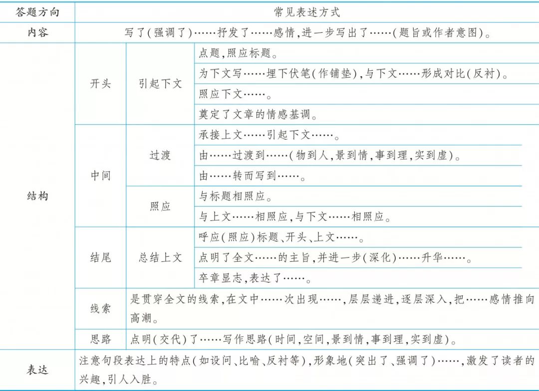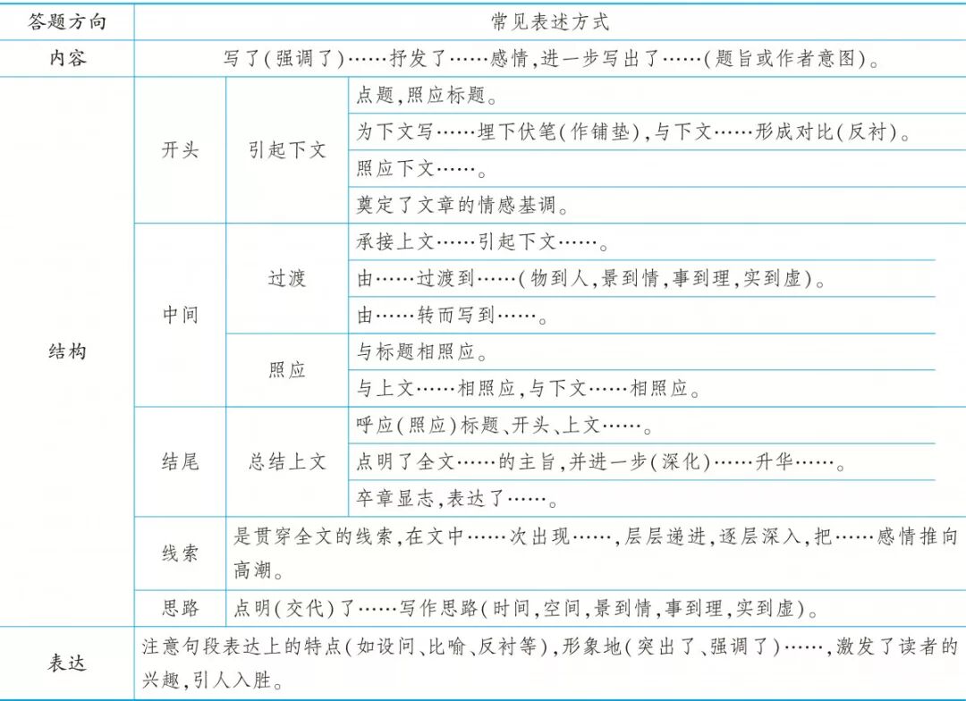 表达效果类 | 一般效果是引入自然,吸引读者,增强感染力;特殊效果须结合语段所用的表达技巧来谈。 |