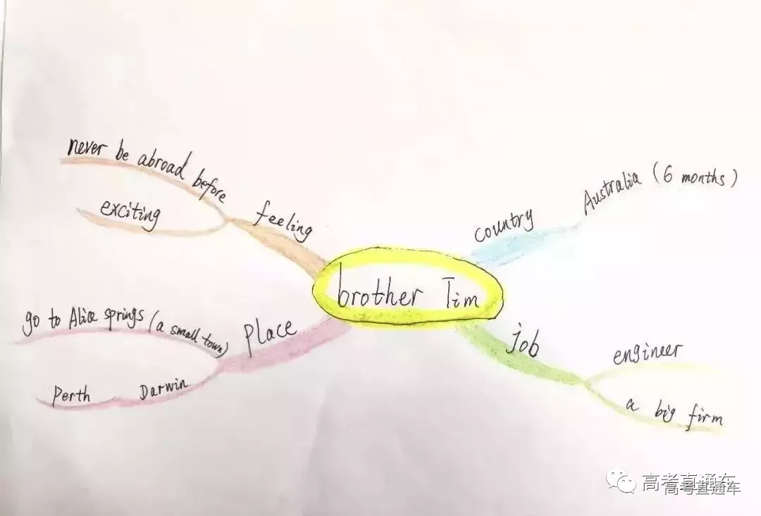abroad before, so he is finding this trip very exciting. 参考译文:我刚刚收到弟弟蒂姆的来信,他正在澳大利亚。他在那儿已经住了6个月了。蒂姆是个工程师,正在一家大公司工作,并且已经去过澳大利亚的不少地方了。他刚买了一辆澳大利亚小汽车,现在去了澳大利亚中部的小镇艾利斯斯普林斯。他不久还将到达达尔文去,从那里,他再飞往珀斯。我弟弟以前从未出过国,因此,他觉得这次旅行非常激动人心。 I have just received aletter from my brother, Tim. He is in Australia. He has been there for six months. Tim is an engineer. He is working for a big firm and he has already visited a great number of different places in Australia. He has just bought an Australian car and has gone to Alice springs, a small town in the centre of Australia. He will soon visit Darwin. From there, he will fly to Perth. My brother has never been abroad before, so he is finding this trip very exciting. Australia, six months? engineer, a big firm? different places, Australia? buy an Australian car, go to Alice springs, a small town ? fly to Perth?never be abroad before? exciting 这一步是最难的,以前我们会阅读完课文就归类,但是难度好大,现在14个词语归类就简单多了! 中心主题:brother Jim 归类:1. country;2. job;3. place;4. feeling 从右上角先画第一个分支country, 然后按顺时针顺序画第二个分支job, 第三个分支place, 第四个分支feeling。 看着思维导图复述课文,然后背诵整篇课文。背诵过程中,要通过联想在脑海里成像,就是把思维导图像拍照片一样拍到脑子里,把思维导图当做回忆的线索。背诵时尽量一字不错一字不落,忠于原文。 如果你还没有用过思维导图背课文,赶紧尝试一下吧!会有意想不到的收获哦! 温馨提示 如果你喜欢本文,记得留意高考直通车的每天推送哦,锁定高考直通车(ID:gkztcwx)即可快速上车!