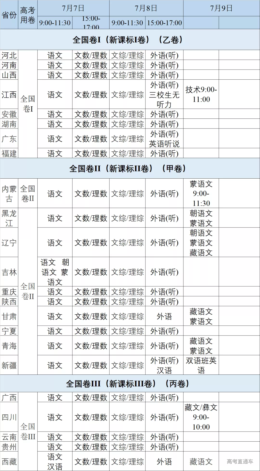 具体科目考试时间安排为:7月7日,语文9:00至11:30;数学15:00至17:00。7月8日,文科综合/理科综合9:00至11:30;外语15:00至17:00。