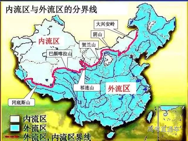 1.外流区和内流区的界线:北段大体沿大兴安岭—阴山—贺兰山—祁连山(东端)一线,南段比较接近200毫米等降水量线