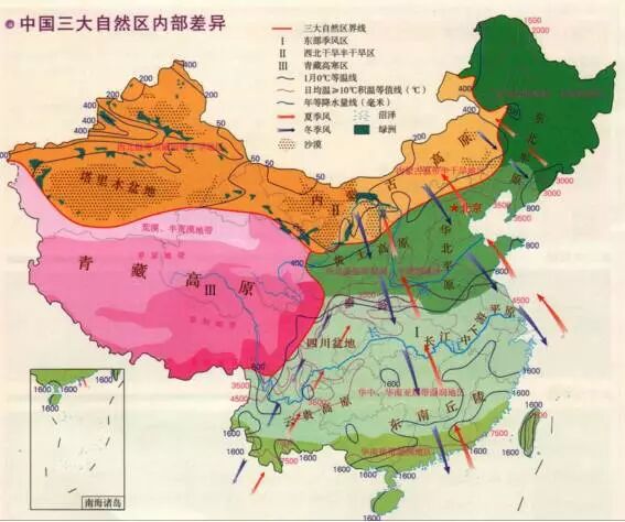 湿润半湿润,八百等降线;亚热暖温带,一月零度线。