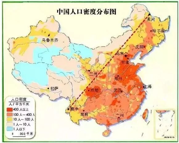 以黑龙江的黑河市和云南省腾冲县划一条直线为界,该线东南部人口多,该线西北部人口少。