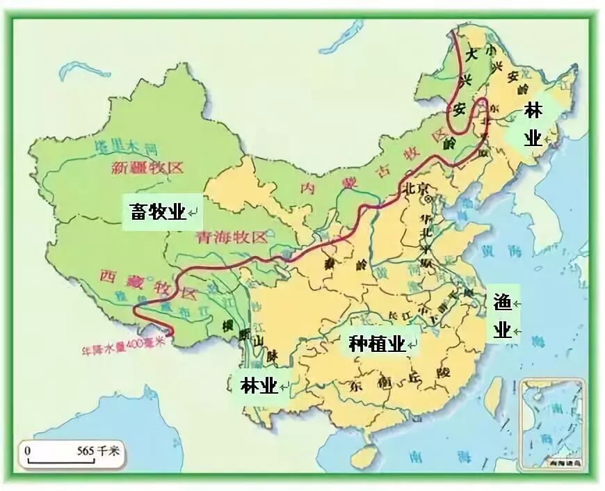 1.牧区与农耕区的界线:大体接近400毫米等降水量线。从东北松嫩平原西部-辽河中上游-阴山山脉-鄂尔多斯高原东缘(除河套平原)-祁连山山脉(除河西走廊)-青藏高原东缘连线。此分界线以东为农区,种植水稻、小麦、玉米、大豆、高粱等作物;此分界线以西为牧区,放养牛、羊、马等牲畜。