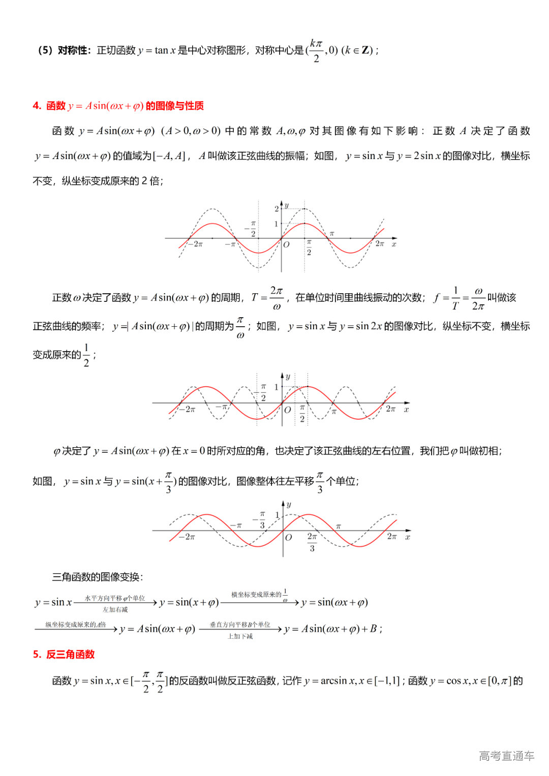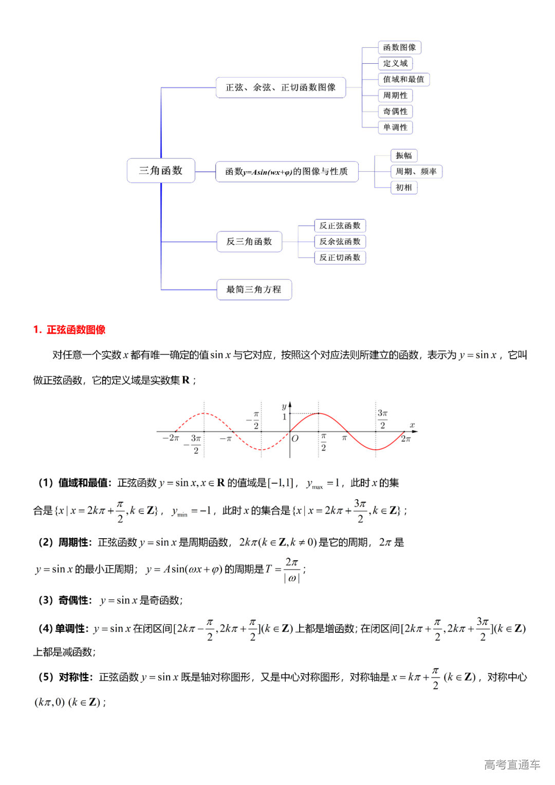 (4)三角比与三角函数:有关概念、同角关系与诱导公式、和、差、倍、半公式、万能公式、辅助角公式、求值、化简、证明、三角函数的图象与性质、三角函数的应用、反三角函数、最简三角方程。
