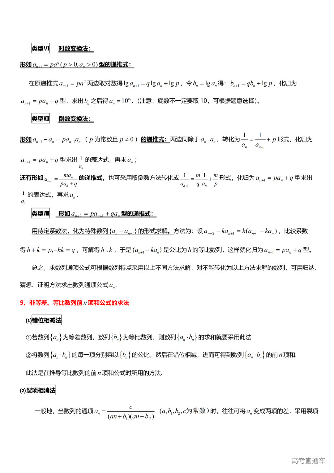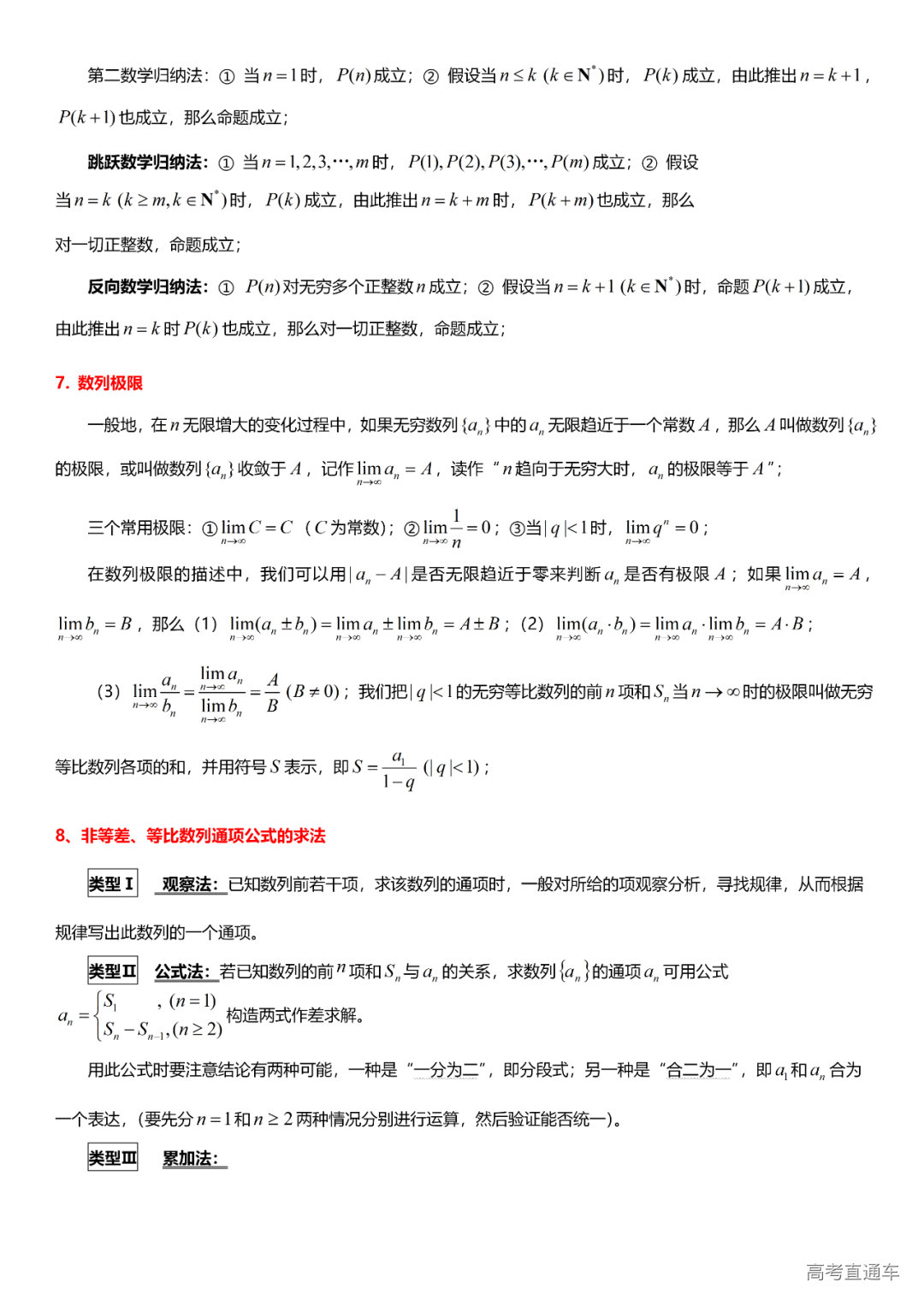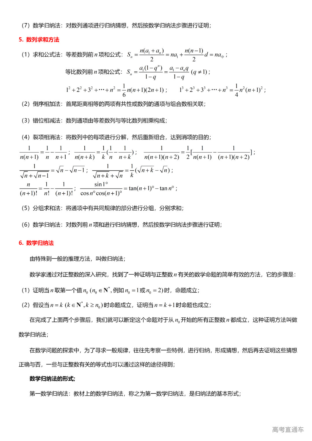(6)数列:数列的有关概念、等差数列、等比数列、通项公式求法、数列求和、数列的应用、数学归纳法、数列的极限与运算、无穷等比数列。