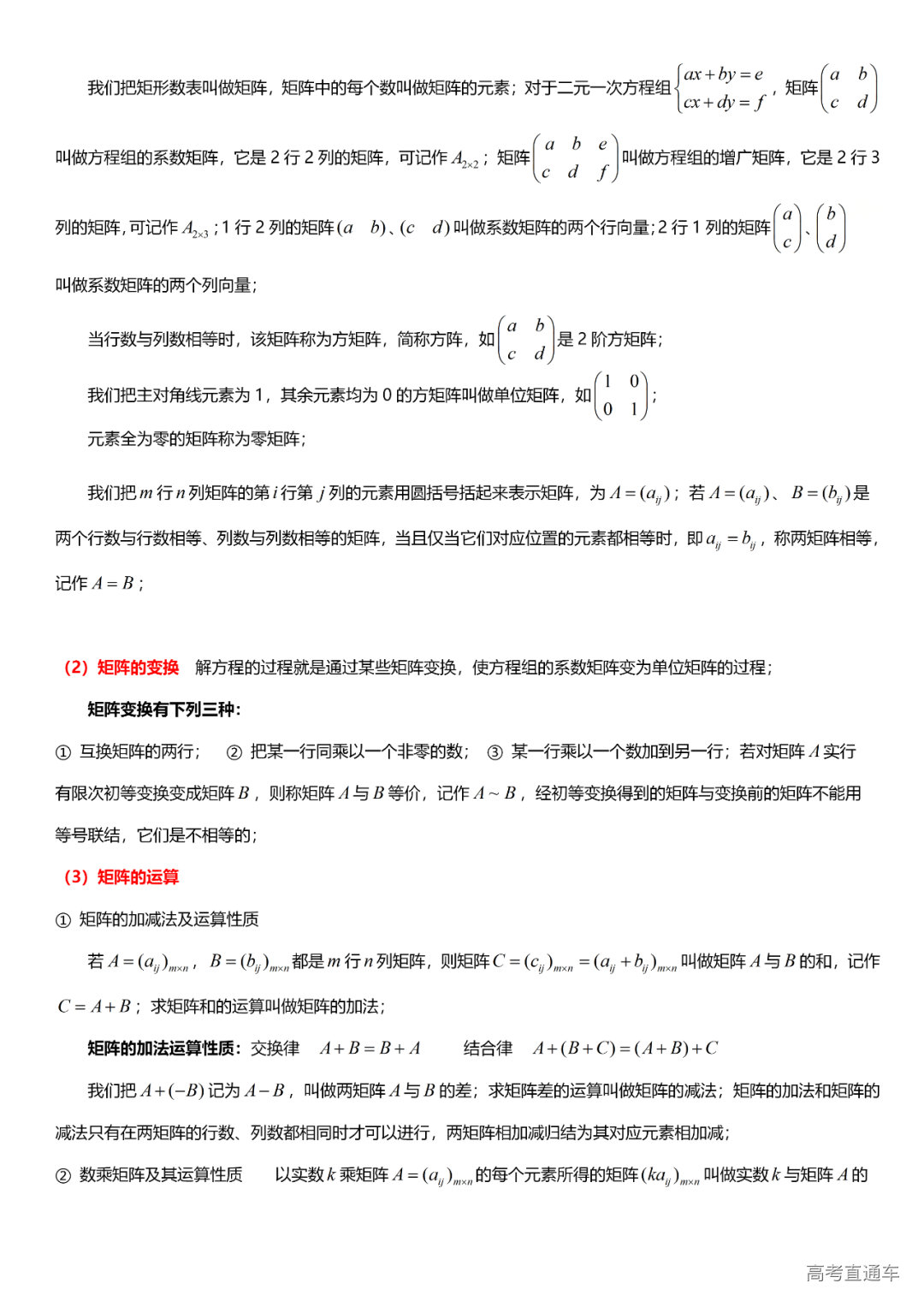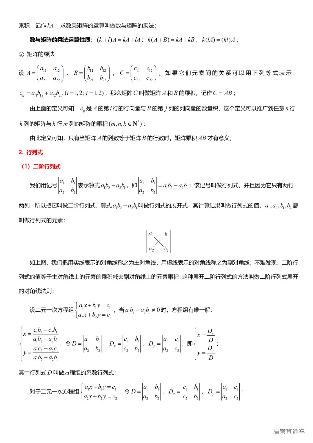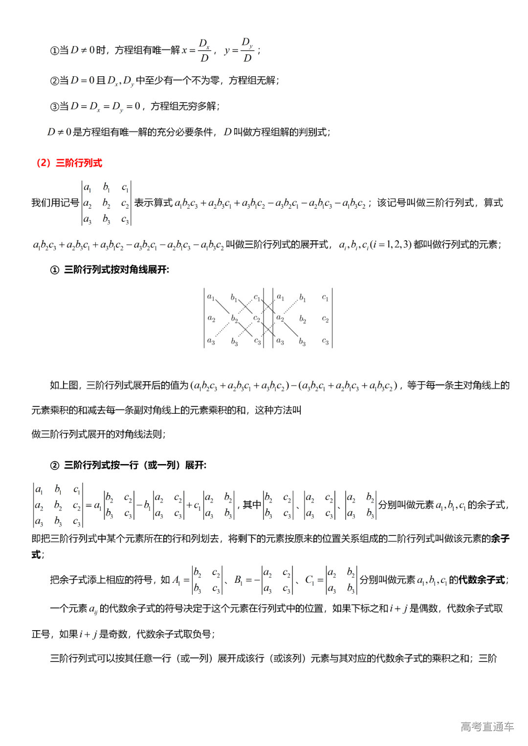 (13)矩阵与行列式初步:二元线性方程组、矩阵的基本运算、二阶行列式、三阶行列式、对角线法则、余子式与代数余子式。