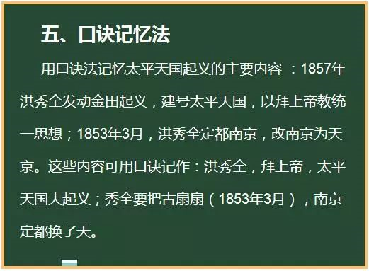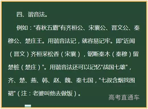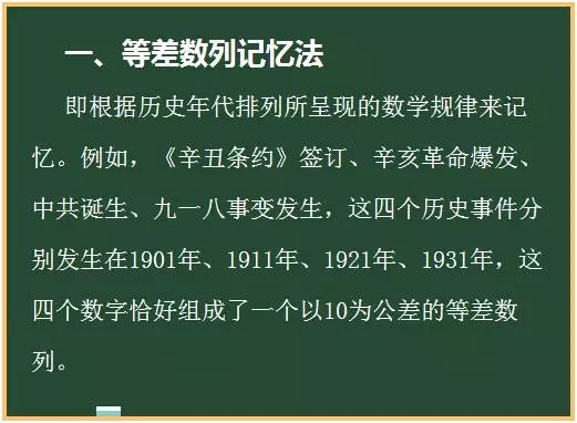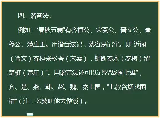 字头记忆法即把要记忆知识部分的字头排列起来记忆,应用时再展开,引出整体内容。这种方法对于记忆需要排列时间或空间位置顺序的知识很有帮助。谐音记忆法是将地名、物产、数据等枯燥乏味的内容编成有趣的语言,便于学生想象,达到“记中乐,乐中记”的 艺术 效果。