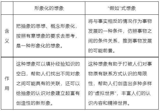 (2)特点:想象以通过感知形成的表象为基本材料,但不是表象的简单再现,而是对表象进行积极的再加工、再组合,所产生的主观形象不一定直接反映现实对象。