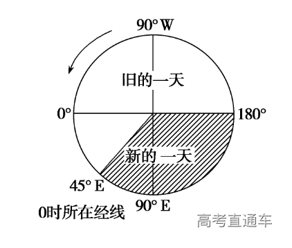 (2)旧的一天的范围:从0时所在经线向西到180°经线,即从45°E向西到180°。