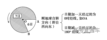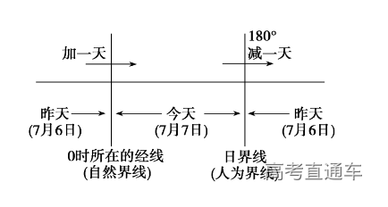 顺着地球自转的方向,过0时经线日期要加一天,过国际日期变更线日期则要减一天。如下图所示: