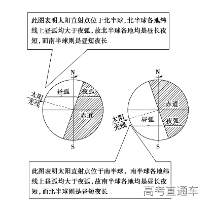 太阳直射点所在的半球位置决定昼夜长短状况。太阳直射点在哪个半球,哪个半球就昼长夜短,且越向该半球的高纬度地区白昼时间越长。太阳直射点所在半球的极点周围出现极昼现象。如下图所示: