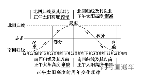 (1)规律:同一地点,正午太阳高度随着季节有规律地变化。其数值具有“来增去减”的特点,即直射点向本地所在纬线移来,则正午太阳高度增大,移去减小。